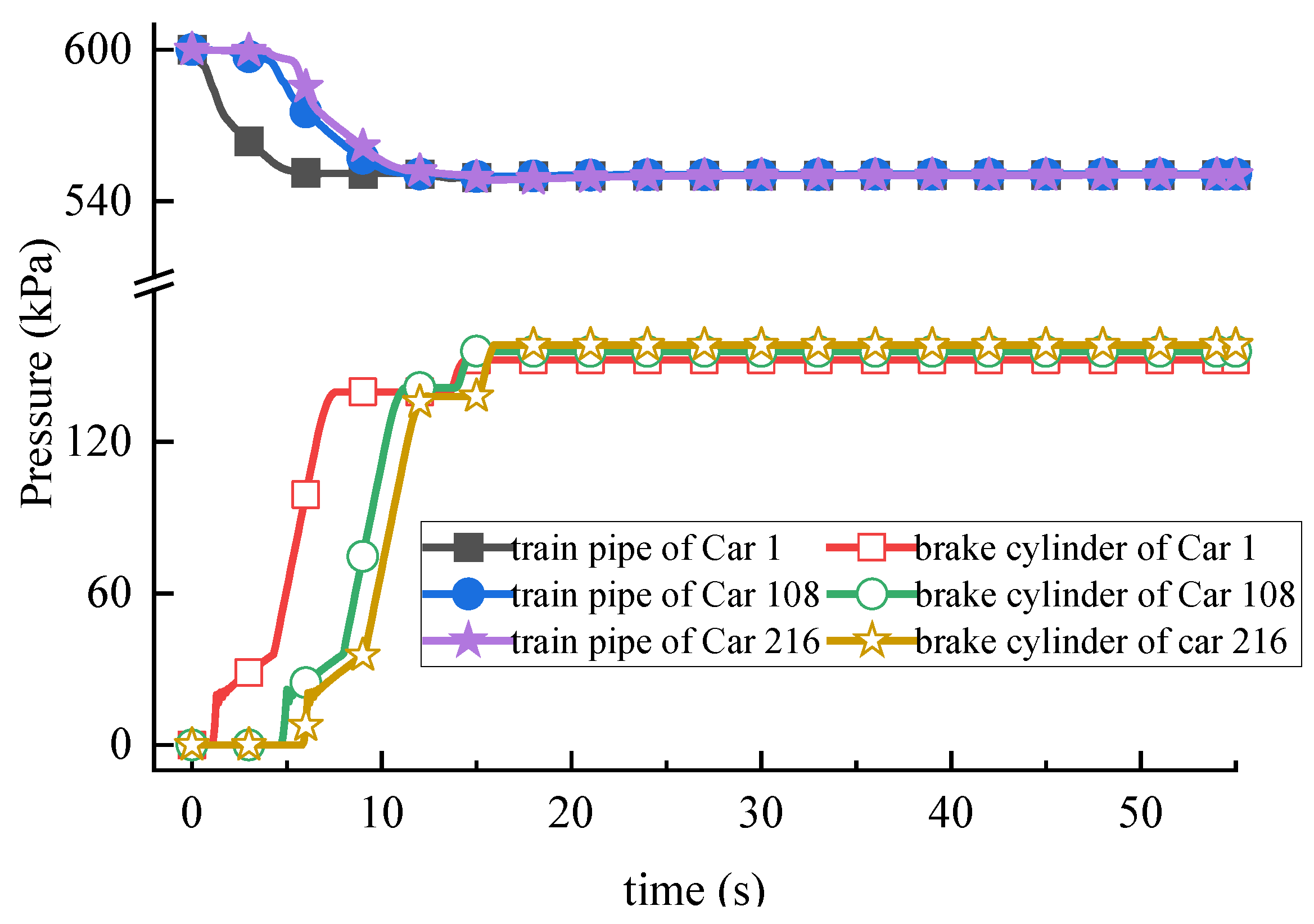 The constant pressure of the train pipe is set at 600 kPa, the temperature is set at 293.15 K. The lag time of the middle slave locomotive is set at 2 s, and the controllable end-of-train device controls the last car to start pressure reduction after 4 s. The train pipe pressure is reduced by 50 kPa, and the simulation results are shown in Figure 4. It can be seen from the figures that the pressure of the train pipe of Car 1 starts to decrease first, the pressure of the train pipe of Car 108 starts to decrease after 2 s, and the pressure of the train pipe of Car 216 starts to decrease after 4 s. When reaching equilibrium, the pressures of the train pipes of Car 1, Car 108, and Car 216 are stabilized at 550 kPa, and the pressures of the brake cylinders at equilibrium are 152 kPa, 155 kPa, and 158 kPa, respectively.