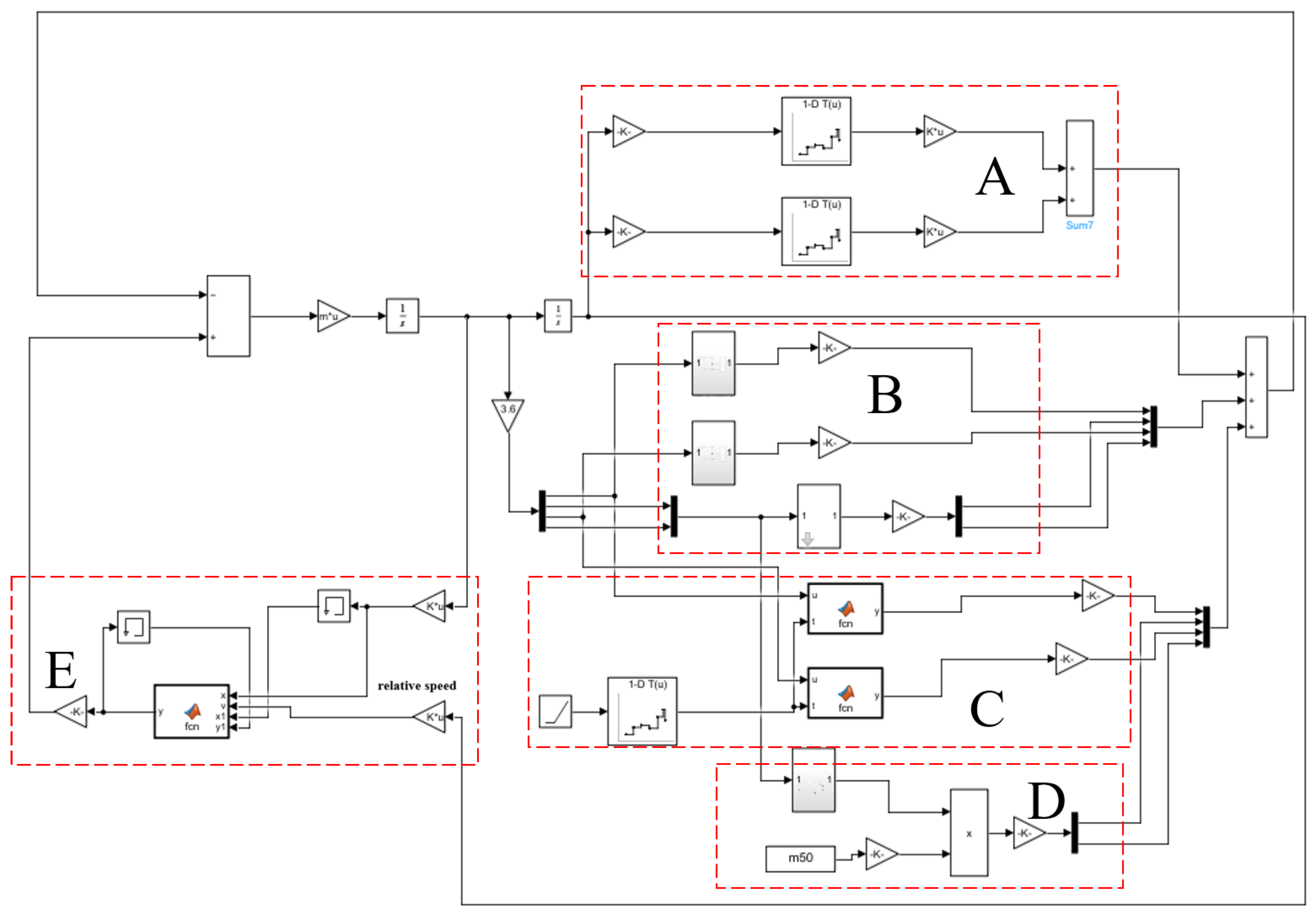 In the formula, is the mass of the i-th car, with the unit of t; are the displacement, velocity, and acceleration of the i-th car, respectively, with the units of m, m/s, m/s2; and are the traction force and electric braking force of the i-th locomotive, respectively, with the unit of kN; and are the front coupler force and rear coupler force of the i-th car, respectively, with the unit of kN; is the air braking force of the i-th car, with the unit of kN; is the running resistance of the i-th car, including basic resistance and additional resistance, with the unit of kN. This paper employs Simulink simulation software (2019 version) to establish a longitudinal dynamics simulation model. Based on the initial conditions of external forces acting on the train, this computational model calculates the acceleration of each vehicle. Through integration operations performed by the Integrator module, the velocity and displacement of each vehicle are derived. Subsequently, parameters such as running resistance, air braking force, locomotive traction force/electric braking force, and coupler force for each vehicle are determined. The acceleration of each vehicle at the next time step is then computed according to the forces acting upon it. As shown in Figure 5. The dotted-line box A represents the train additional resistance module, B represents the basic running resistance module, C represents the locomotive traction force and electric braking force module, D represents the air braking force module, and E represents the coupler force module. We employed the AMESim-Simulink interface with Simulink as the Master. The numerical integration was handled via a fixed-step (1 ms) ode4 solver in Simulink, and a variable-step BDF solver in AMESim. The co-simulation maintained a strict 1 ms communication interval using a lock-step synchronization strategy. Key tolerances in AMESim were set to 1.0 × 10−4 (relative) and 1.0 × 10−6 (absolute).