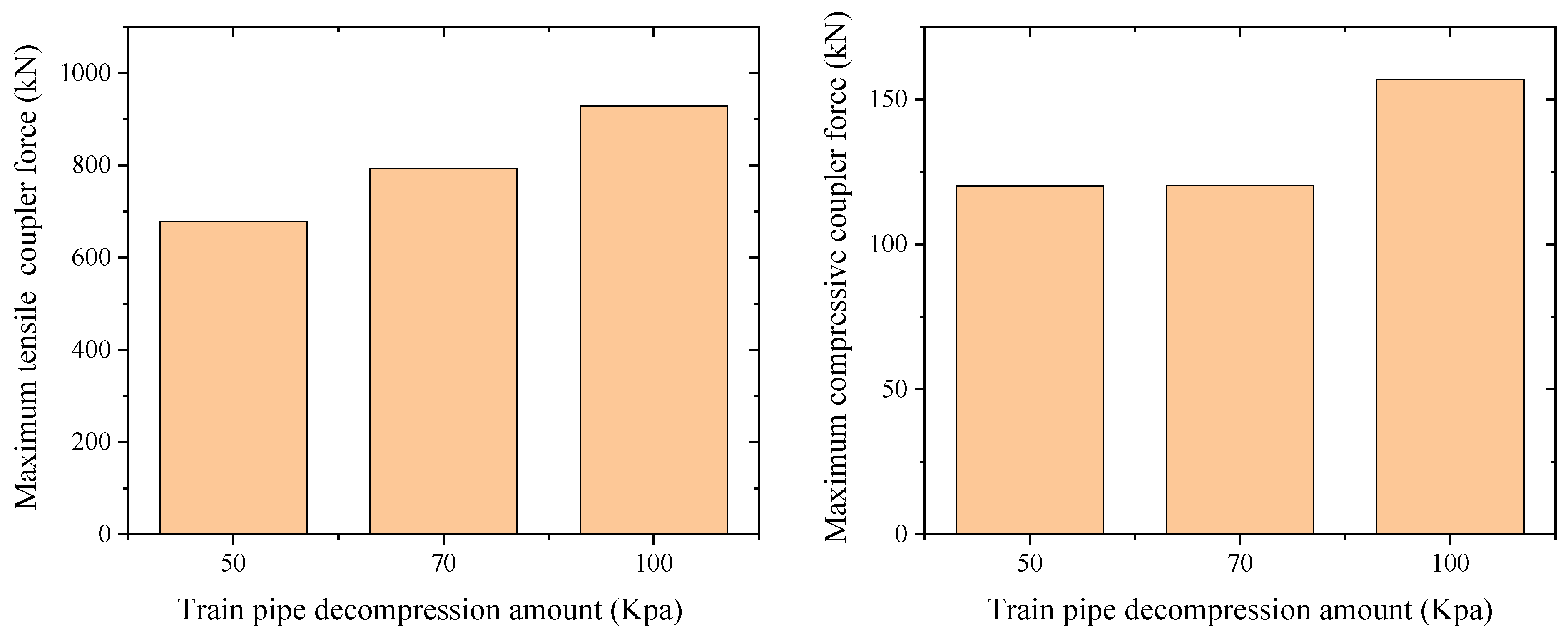 Maximum coupler force under different decompression amounts of train pipes.