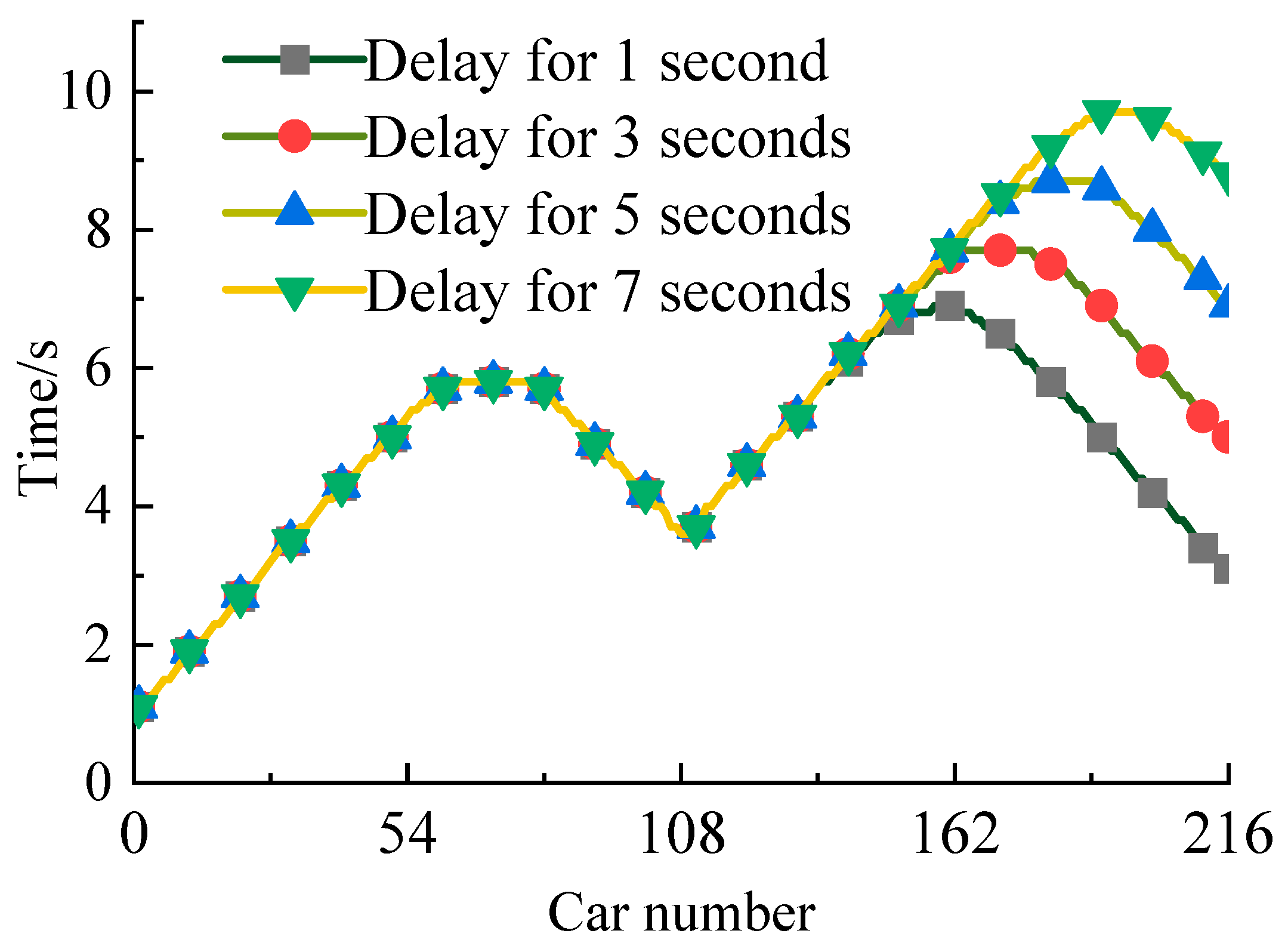 The influence of the controllable end-of-train device action delay on the starting braking time of each car is shown in Figure 8. During the train braking process, the controllable end-of-train device affects the braking of the middle and rear cars by providing a braking source for the last car. Under the condition of a 1 s action delay of the end-of-train device, the 162nd car starts braking the latest, at 6.9 s. Under the condition of a 7 s braking delay of the end-of-train device, the 193rd car starts braking the latest, at 9.7 s. The results show that as the action delay of the end-of-train device increases, the number of cars affected by the controllable end-of-train device during the braking process decreases, the latest starting braking time of the cars increases, and the car numbers are more towards the rear.