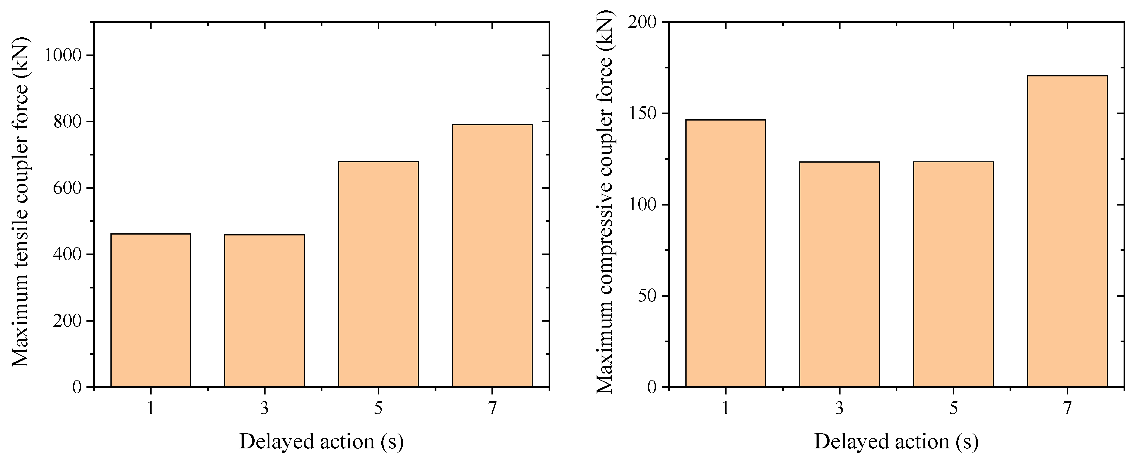 Maximum coupler force under different braking time delays.
