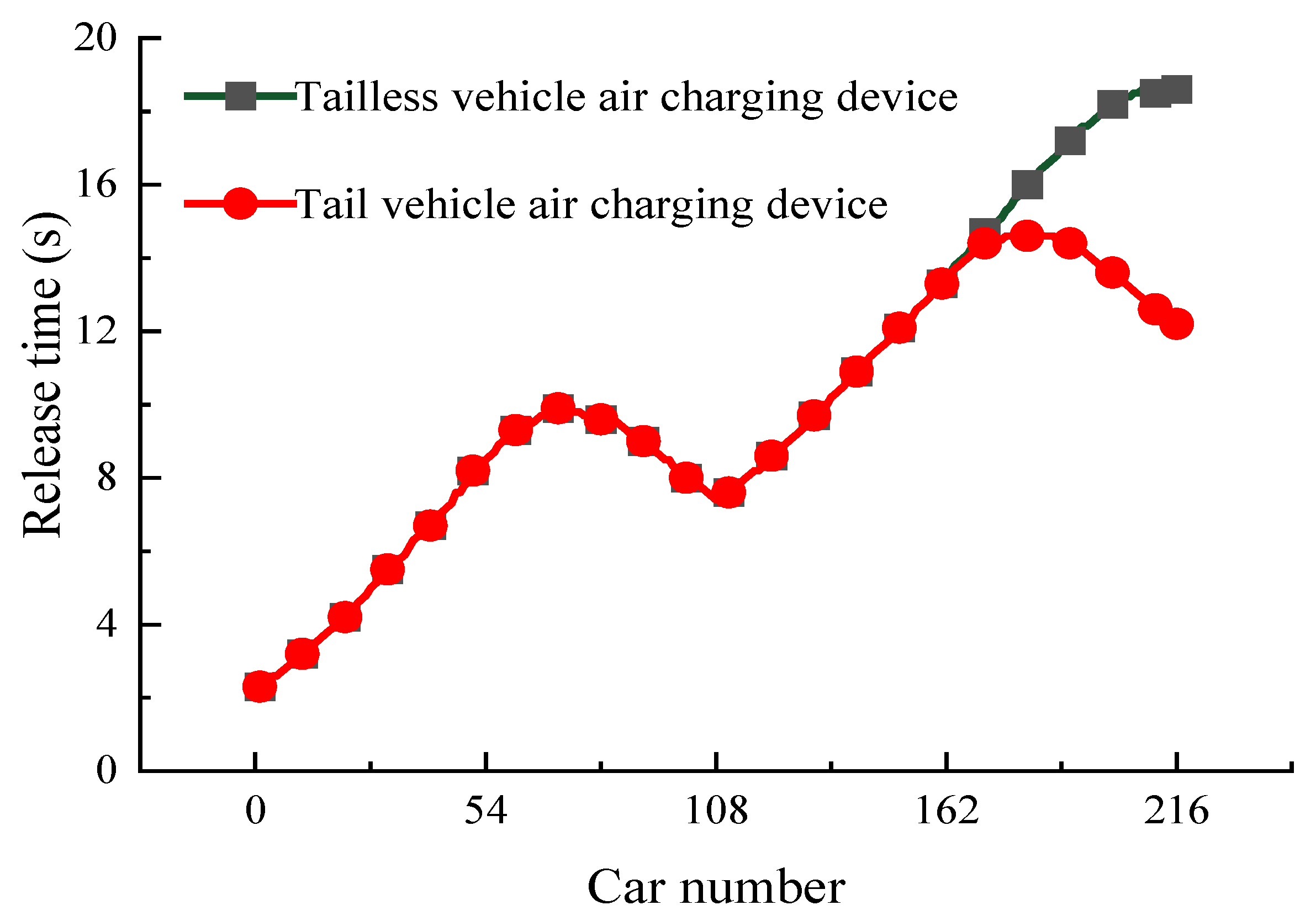 The influence of the presence or absence of the tail car air charging device on the initial relief time of each car is shown in Figure 11. The tail car air charging device mainly affects the cars in the tail area, and the initial relief time of the cars in the front and middle parts of the train remains unchanged. When there is no tail car air charging device, the 216th car at the tail starts to relieve at the latest at 18.6 s. After adding the tail car air charging device, the 181st car starts to relieve at the latest at 14.6 s. The tail car air charging device improves the relief synchronization of the train by charging air to the tail cars.