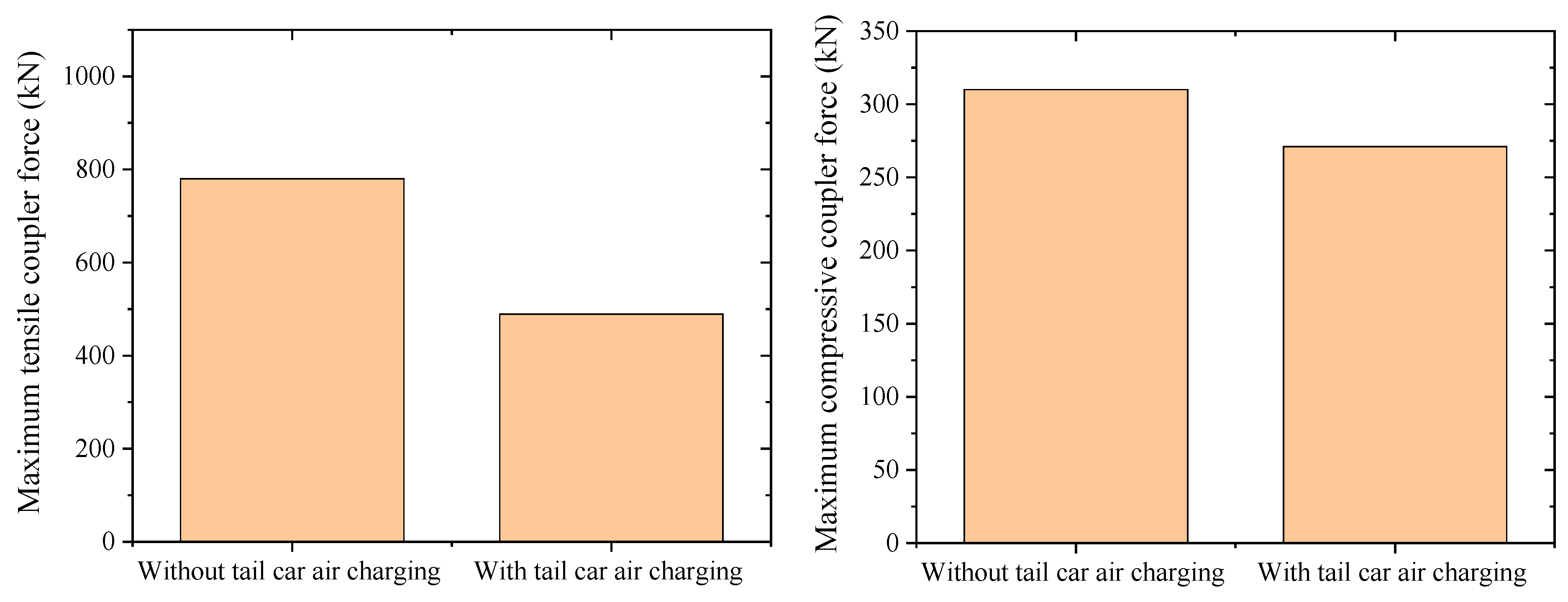 Maximum coupler force without and with tail car air charging device.