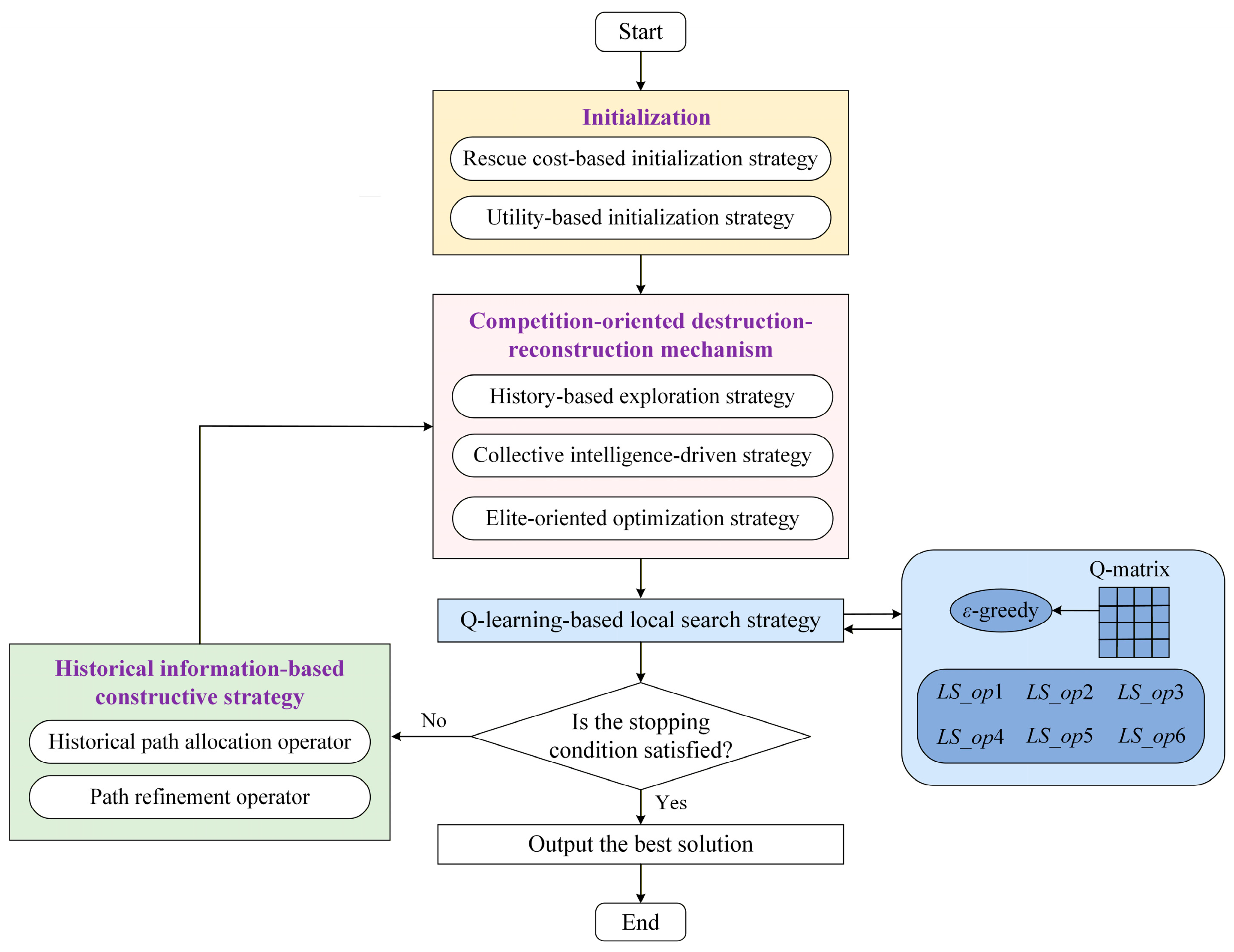In the initialization phase, two problem-specific heuristic schemes (i.e., a utility-based initialization strategy and a rescue cost-based initialization strategy) are designed to establish an initial population composed of high-quality individuals. In the destruction and reconstruction phase, a competition-oriented destruction-reconstruction mechanism generates candidate solutions and selects the optimal individual from the candidate solutions to conduct local search. This mechanism includes a history-based exploration strategy, a collective intelligence-driven strategy, and an elite-oriented optimization strategy to improve the search process. By integrating into the competition-oriented destruction-reconstruction mechanism, individuals in the population undergo a process of selection, continuously filtering out the optimal solutions, which further improves search efficiency. The competition mechanism prompts the algorithm to select the best individuals, thereby accelerating the global search. In the local search phase, a Q-learning-based local search strategy is investigated to select six neighborhood operators to improve the quality of solutions. To overcome the limitations of traditional fixed selection strategies in complex problems, Q-learning adapts by selecting operators and dynamically adjusting the search strategy, allowing the algorithm to make flexible decisions based on the current solution’s state and historical experience. This effectively balances global and local optimization, improving search efficiency and enhancing the quality of the solution. The proposed QPIG framework is presented in Algorithm 1. Lines 10 to 19 of Algorithm 1 describe the acceptance criteria phase, while lines 20 to 24 provide a historical information-based constructive strategy, which clears the stored historical solution set periodically after a predefined number of executions. Specifically, the historical information-based constructive strategy includes the historical path allocation operator and path refinement operator to accelerate the convergence speed of the algorithm. The algorithm continues executing the above loop until the stopping criterion is met and then outputs the optimal path.