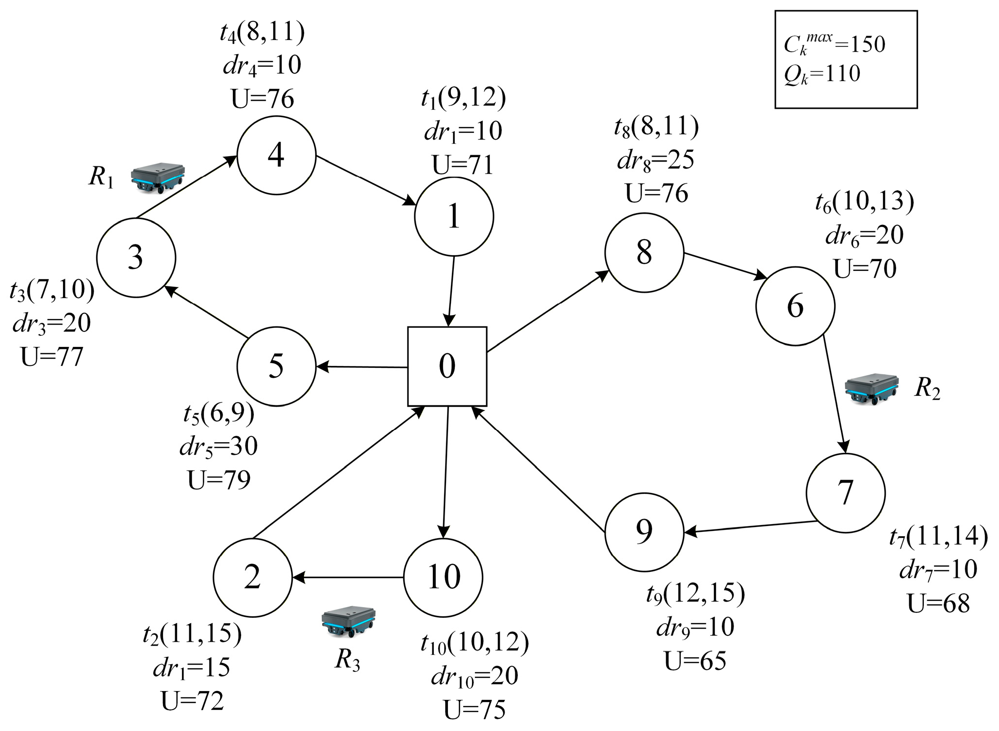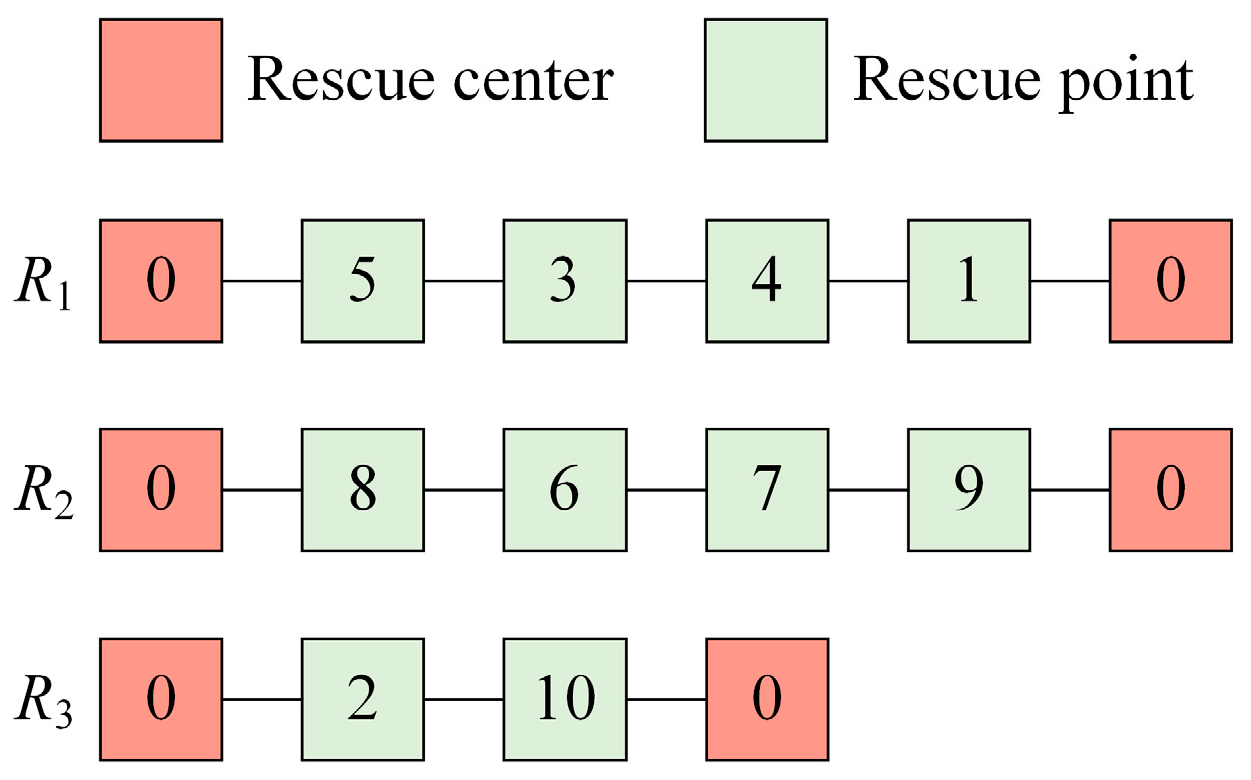 The problem is formulated as a directed connected graph G = (N, A), where N = {0} ∪ T is the set of vertices, 0 denotes the rescue center, T is defined as the set of rescue points, and A = {(i, j)|i, j ∈ T, i = j} is τ, the arc set composed of distances between rescue points. All rescue tasks are performed by k robots, and the robot set is R = {1, 2, …, k}. Each rescue point must be accessed by at least one robot to ensure smooth completion of all tasks. Additionally, without compromising generality, the following assumptions have been made: