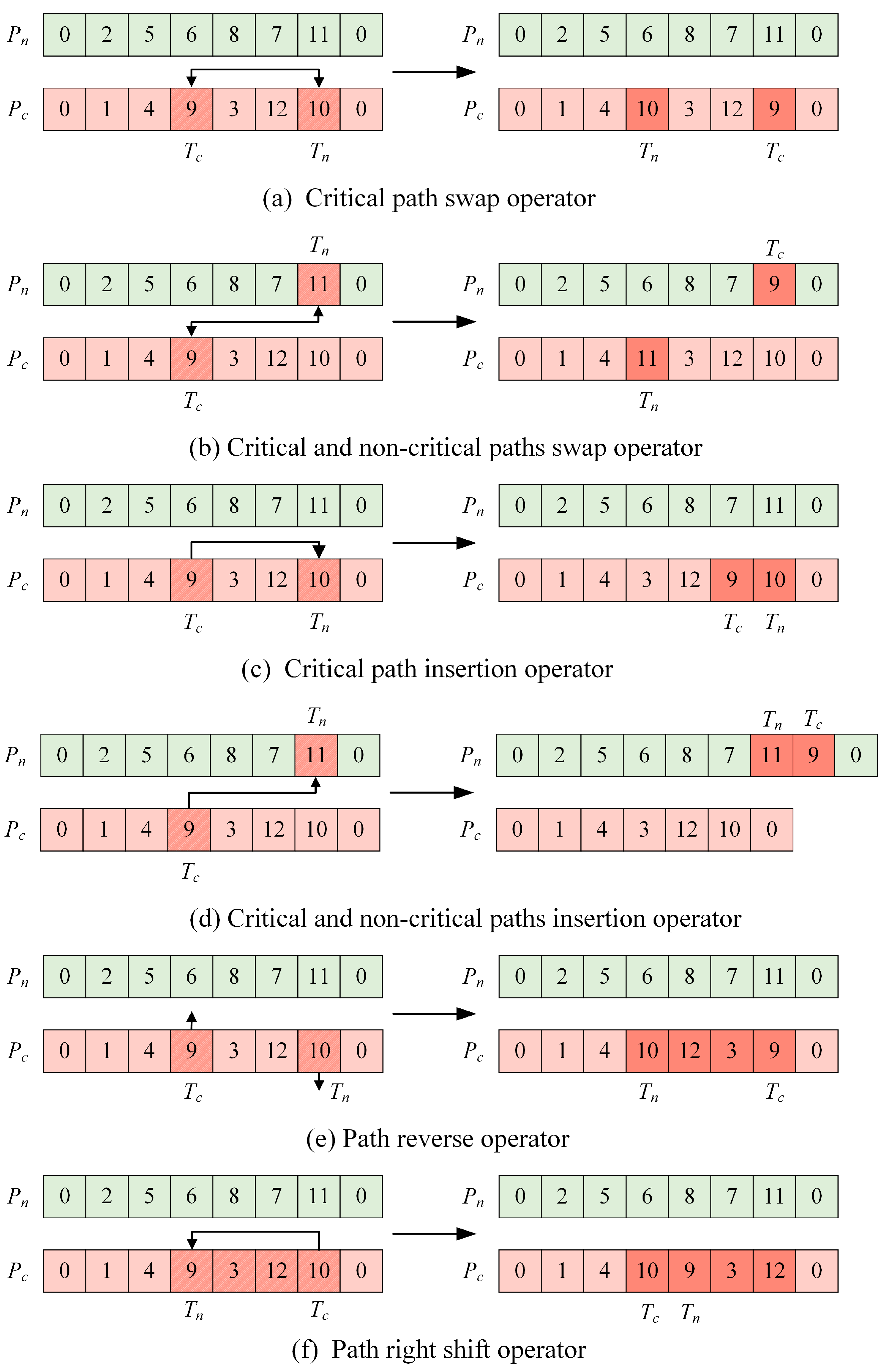 Tc at random from the critical path, and randomly choose a non-critical path from the solution. Subsequently, insert the critical task