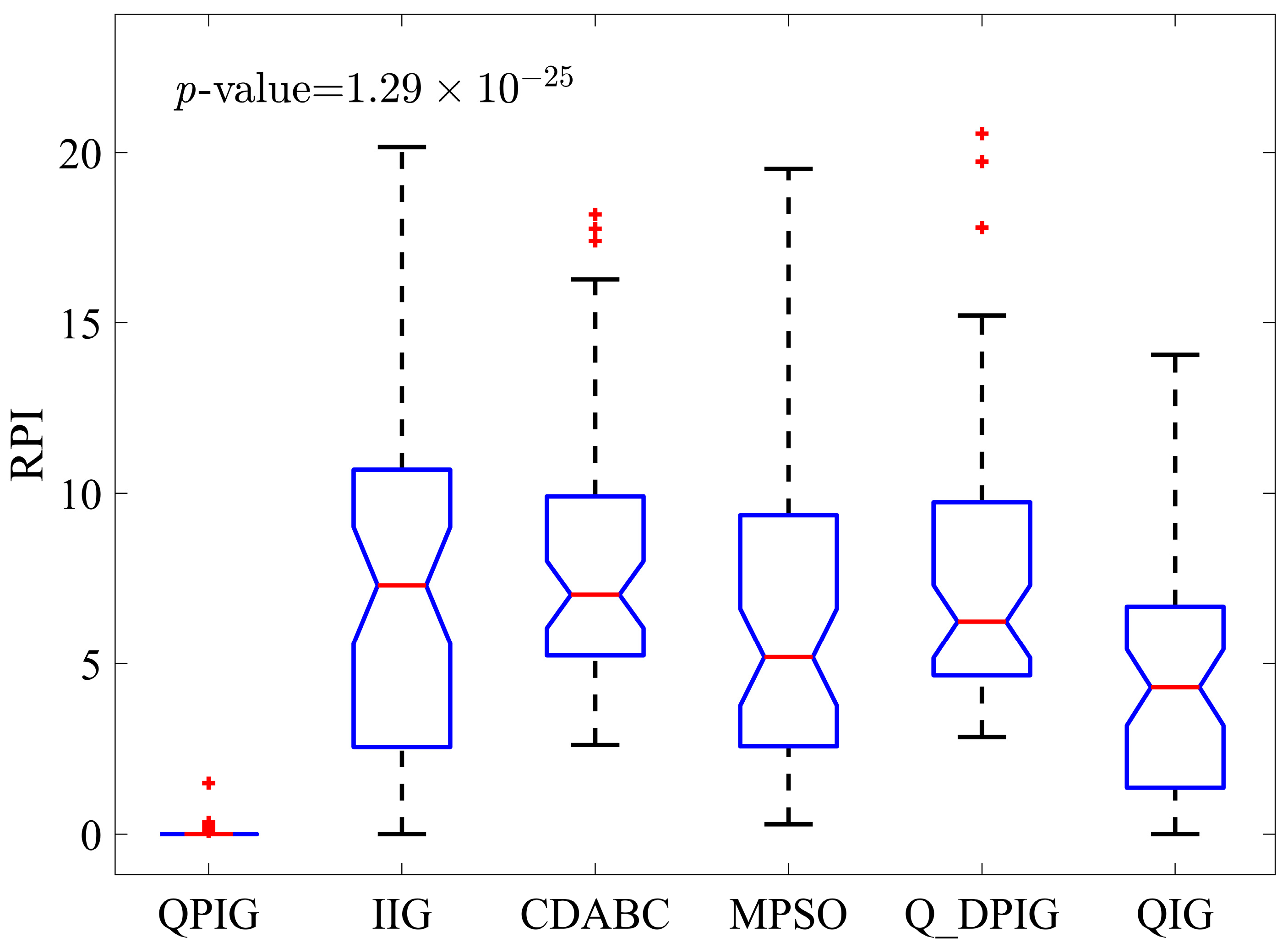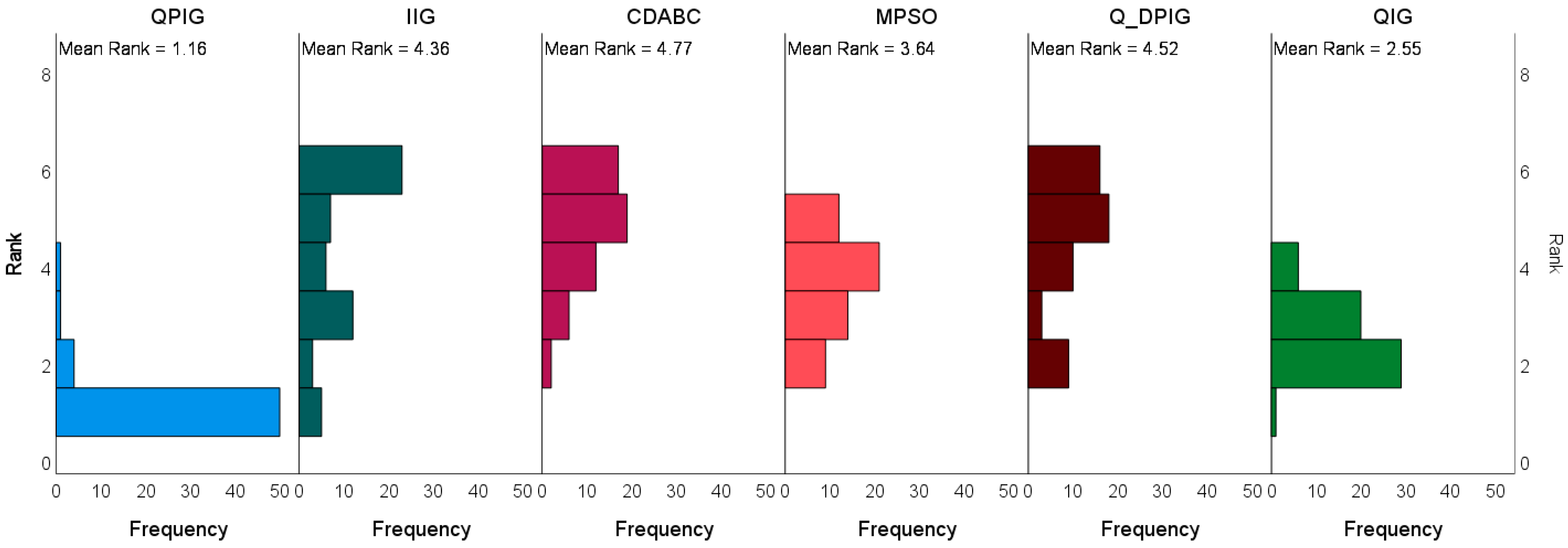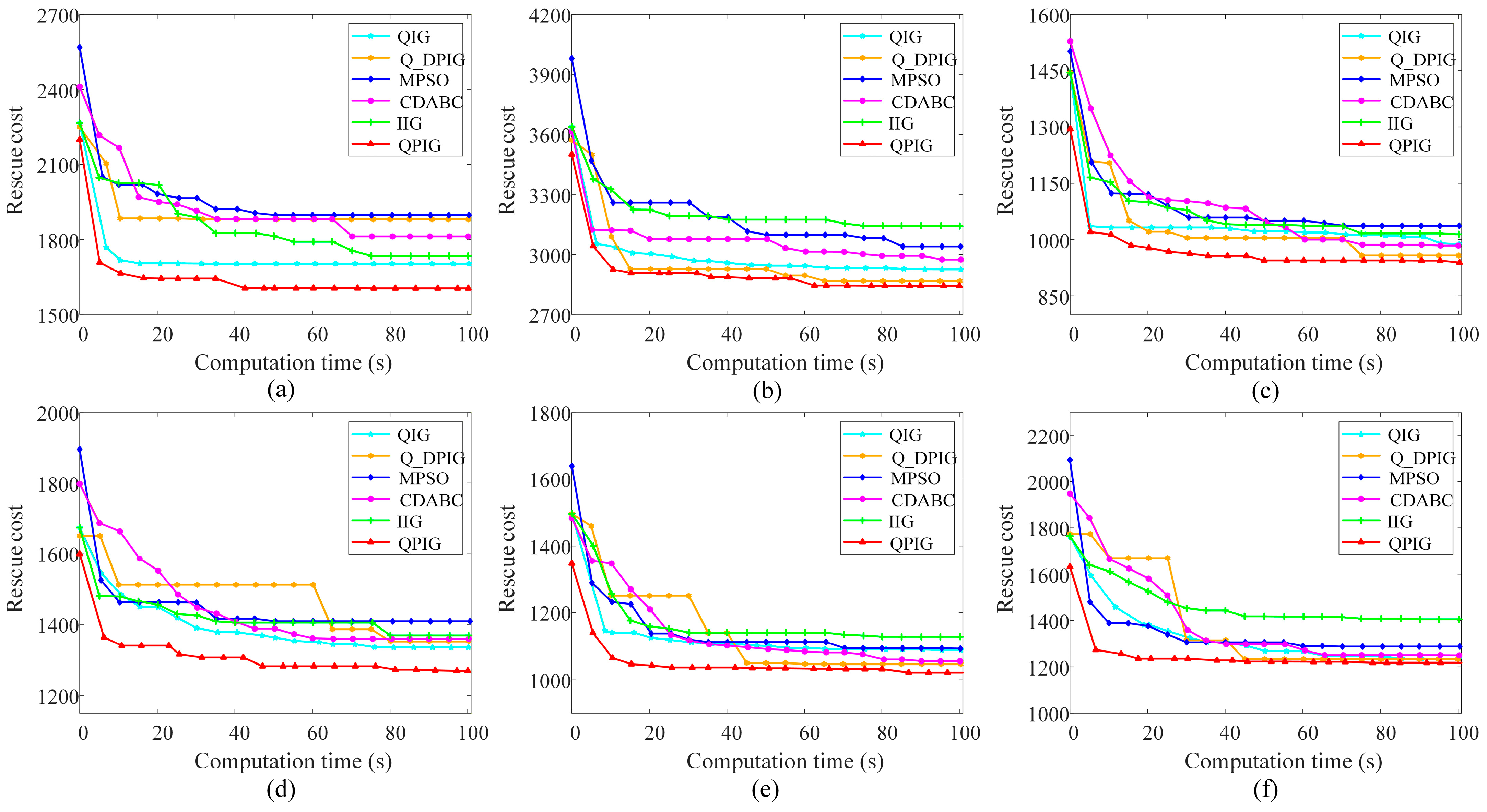 In the initialization phase, two problem-specific heuristic strategies are designed, including the utility-based initialization strategy and the rescue cost-based initialization strategy. The time complexity of the utility-based initialization strategy is O(n2), and similarly, the time complexity of the rescue cost-based initialization strategy is also O(n2), where n represents the number of rescue points. In the destruction and reconstruction phase, a competition-oriented destruction-reconstruction mechanism is developed to improve the diversity of the search process. Specifically, the time complexity of the history-based exploration strategy is O(ld), where ld represents the destruction-reconstruction size. The collective intelligence-driven and elite-oriented optimization strategies each have a time complexity of O(ps⋅ld), where ps denotes the population size. Additionally, operations such as merging populations and selecting the top individuals introduce a complexity of O(ps) and O(pslogps), respectively. Therefore, the overall time complexity of this mechanism is O(ps⋅ld + pslogps). In the local search phase, six neighborhood operators, i.e., critical path swap, critical path and non-critical path swap, critical path insertion, critical path and non-critical path insertion, path reverse, and path right shift operators, each have a time complexity of O(n). Additionally, operations such as Q-value updates, reward calculations, and state management are also performed. Therefore, the overall time complexity of the Q-learning-based local search strategy is O(n⋅G), where G is the number of iterations in this strategy. The time complexity of the historical information-based constructive strategy is O(n2). In summary, the time complexity of the QPIG algorithm is O(n2).