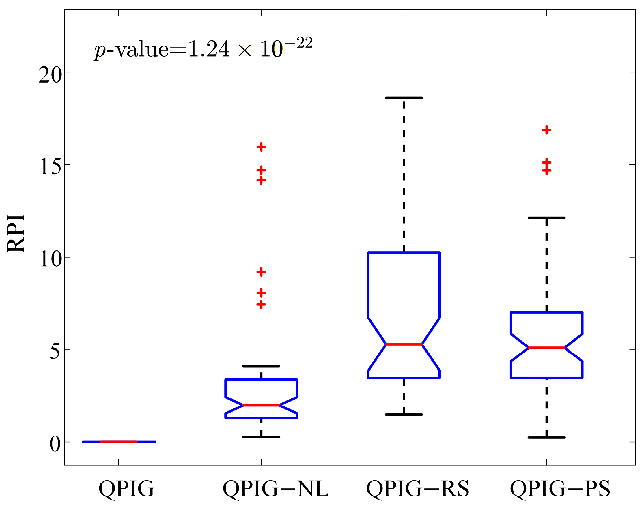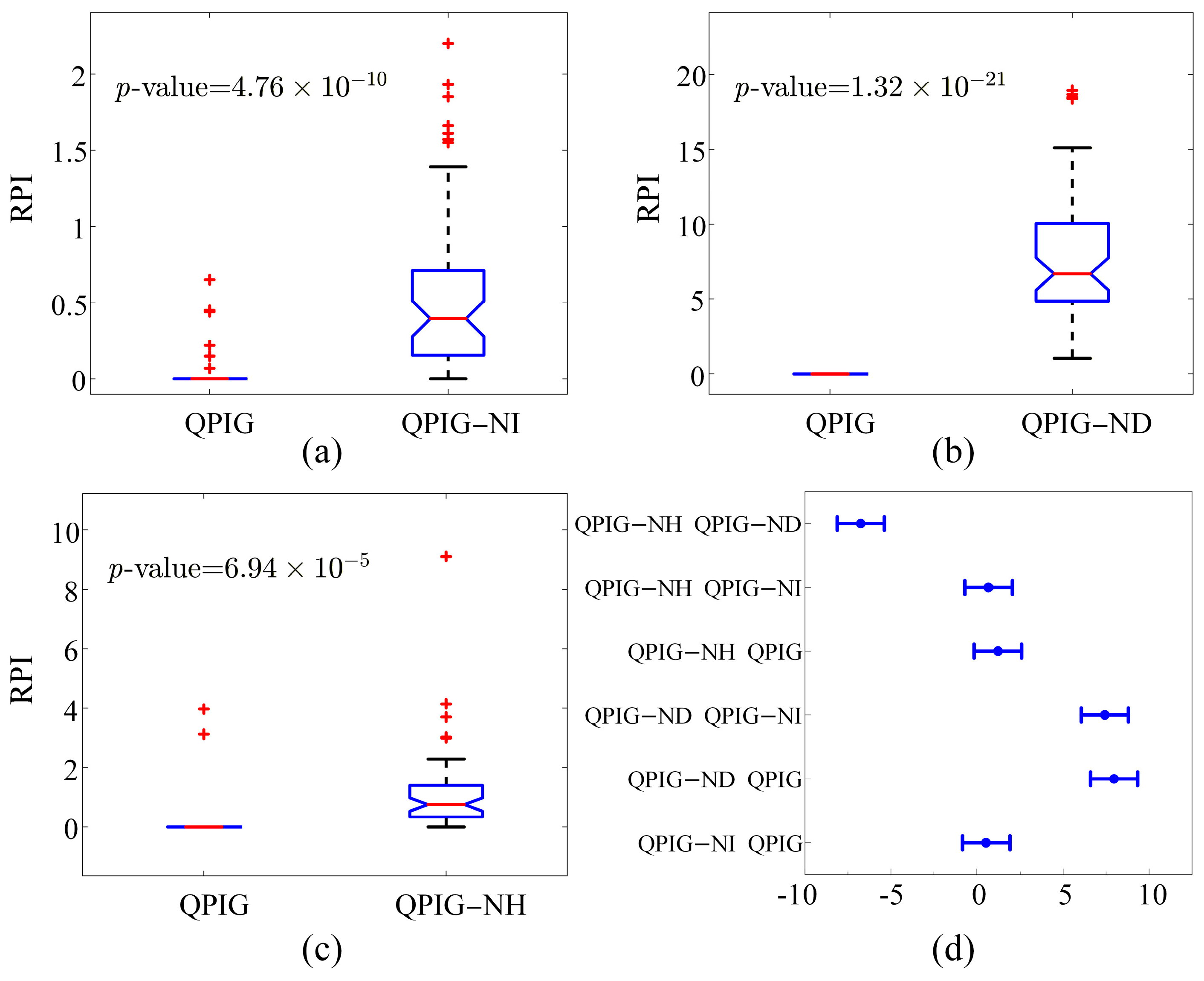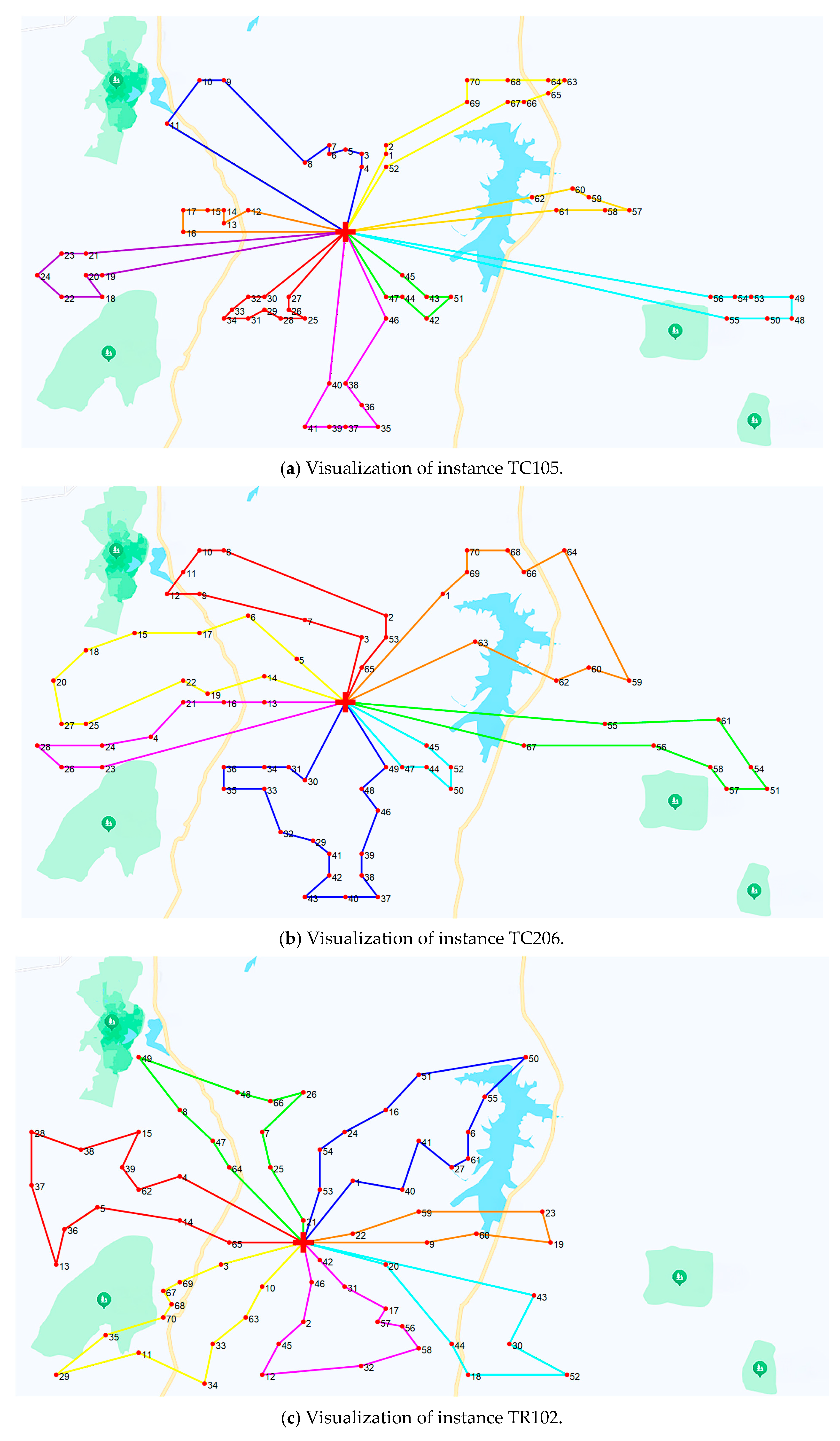 In the initialization phase, two problem-specific heuristic strategies are designed, including the utility-based initialization strategy and the rescue cost-based initialization strategy. The time complexity of the utility-based initialization strategy is O(n2), and similarly, the time complexity of the rescue cost-based initialization strategy is also O(n2), where n represents the number of rescue points. In the destruction and reconstruction phase, a competition-oriented destruction-reconstruction mechanism is developed to improve the diversity of the search process. Specifically, the time complexity of the history-based exploration strategy is O(ld), where ld represents the destruction-reconstruction size. The collective intelligence-driven and elite-oriented optimization strategies each have a time complexity of O(ps⋅ld), where ps denotes the population size. Additionally, operations such as merging populations and selecting the top individuals introduce a complexity of O(ps) and O(pslogps), respectively. Therefore, the overall time complexity of this mechanism is O(ps⋅ld + pslogps). In the local search phase, six neighborhood operators, i.e., critical path swap, critical path and non-critical path swap, critical path insertion, critical path and non-critical path insertion, path reverse, and path right shift operators, each have a time complexity of O(n). Additionally, operations such as Q-value updates, reward calculations, and state management are also performed. Therefore, the overall time complexity of the Q-learning-based local search strategy is O(n⋅G), where G is the number of iterations in this strategy. The time complexity of the historical information-based constructive strategy is O(n2). In summary, the time complexity of the QPIG algorithm is O(n2).