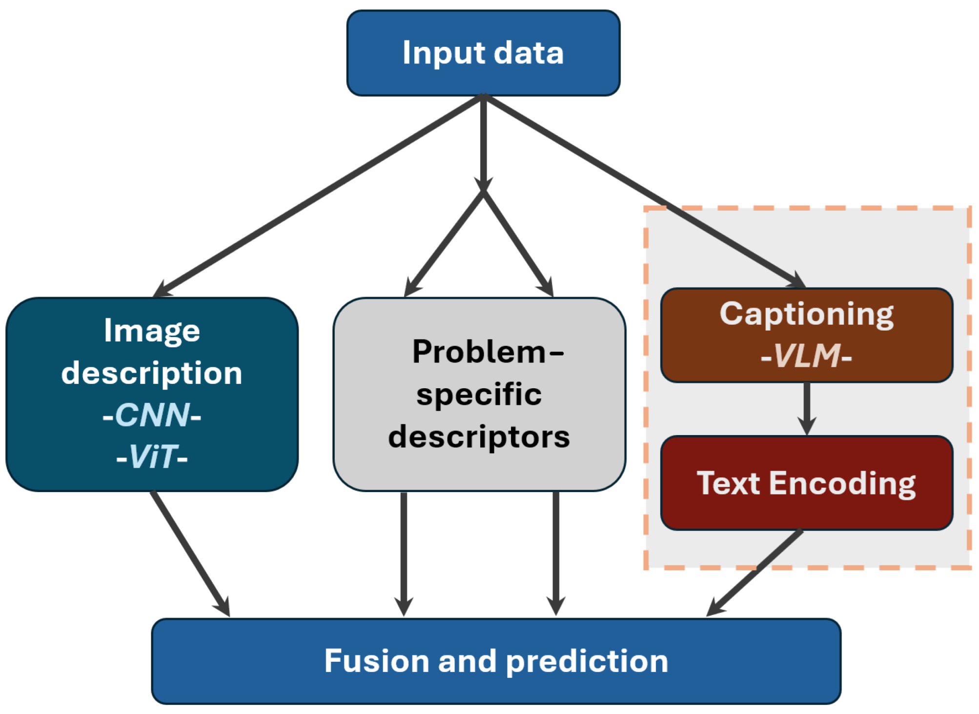 - Image description is marked with blue. The image content can be described using either a convolutional neural network (CNN, suitable for low-resource settings) or a Visual Transformer (ViT).