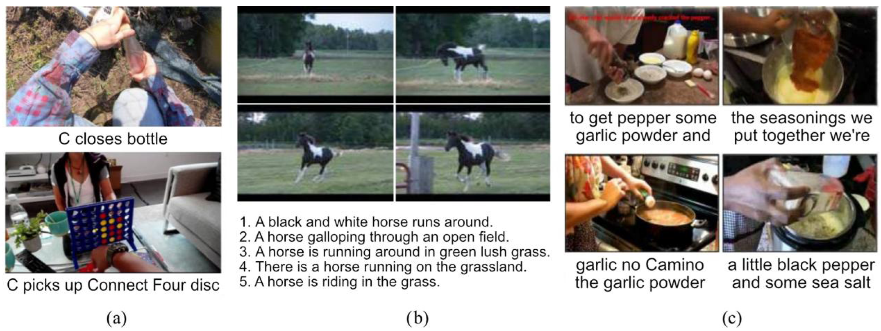 - Miech, A.; Zhukov, D.; Alayrac, J.B.; Tapaswi, M.; Laptev, I.; Sivic, J. Howto100m: Learning a text-video embedding by watching hundred million narrated video clips. In Proceedings of the IEEE/CVF International Conference on Computer Vision, Seoul, Republic of Korea, 27 October–2 November 2019; pp. 2630–2640. [Google Scholar]