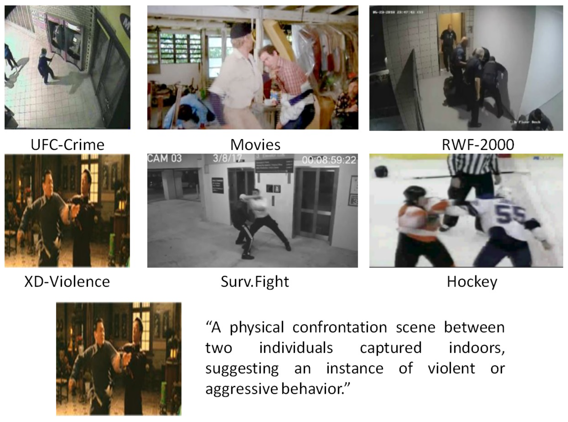 | Surv. Fight [130] | 300 | Fights (kicks, fists, wrestling) vs. non-fight | YouTube (cafes, streets, buses) | Short clips (2 s) from real-world surveillance. |
