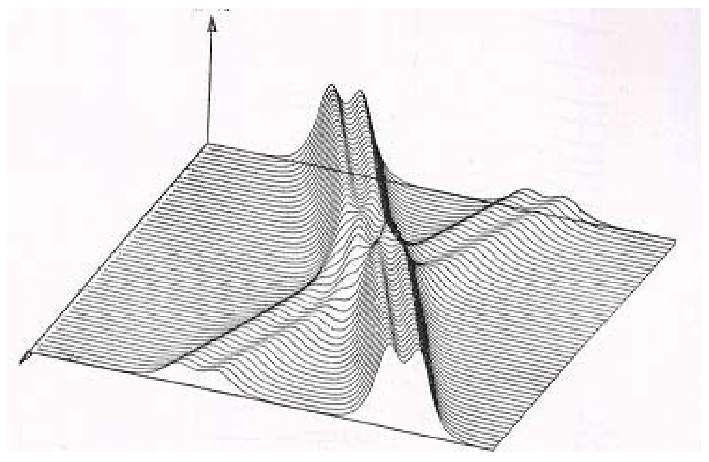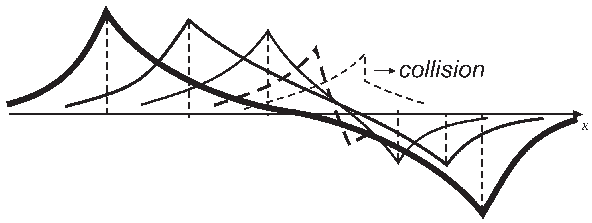 . The solitons move in opposite directions and when they collide, a new weaker wave arises. The initial two solitons continue to travel after the collision with the same shape.