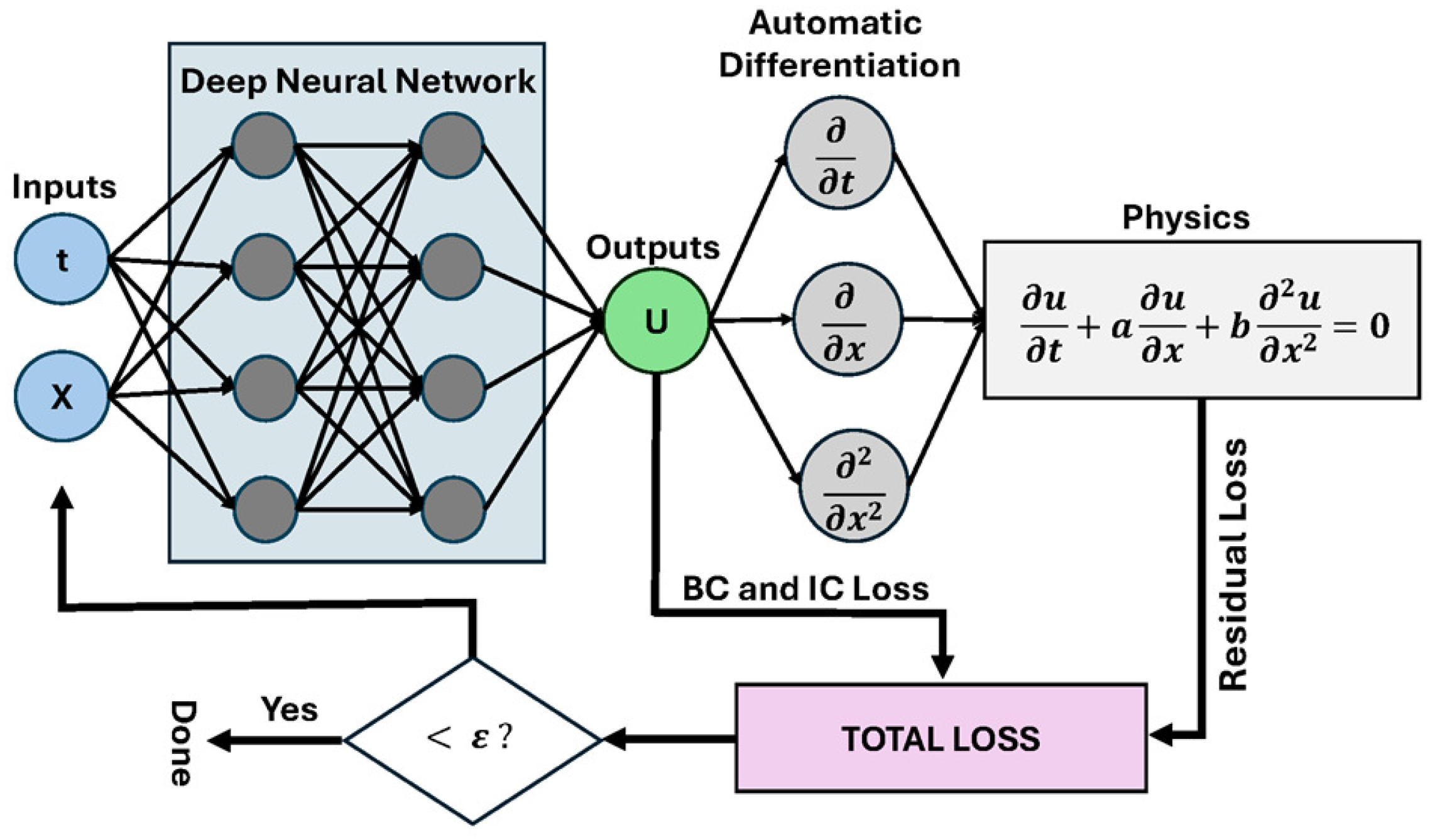 There are three main blocks—including neural networks and PINNs which, through automatic differentiation, incorporate the governing differential equations and loss function minimization block.