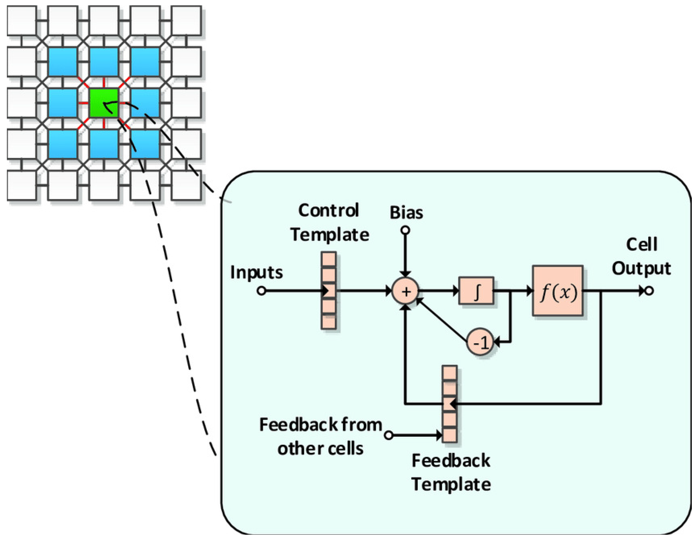 . All cells are identical. The structure of a single cell is given in the figure—it consists of a feedback template, a control template, bias, and cell input and output. The interaction of each cell with its neighbor cells is obtained through feedback from other cells. Usually the cells are nonlinear dynamical systems. The interaction between cells is linear, which means that the spatial structure of CNNs is linear and for this reason they are very suitable for solving physics and engineering problems.