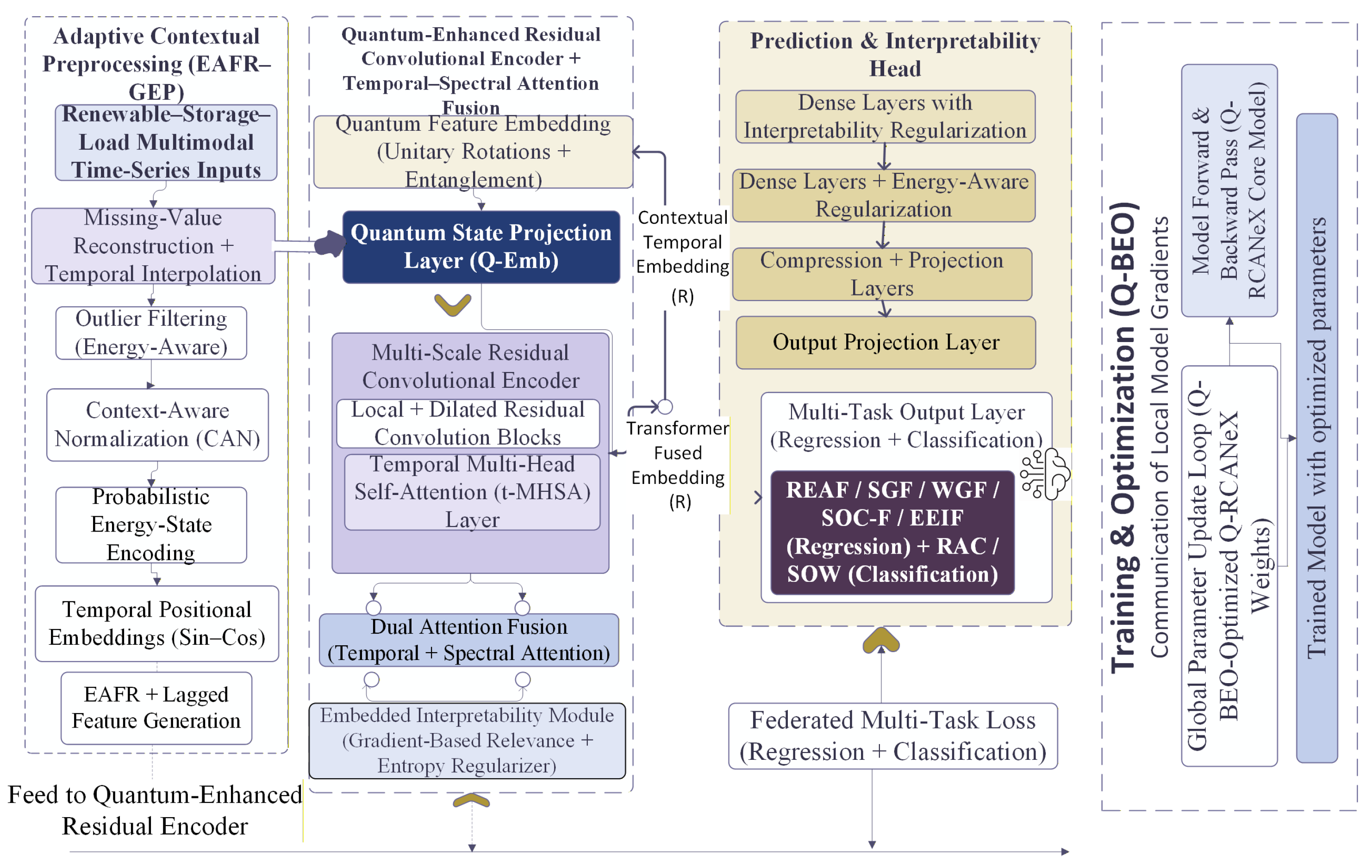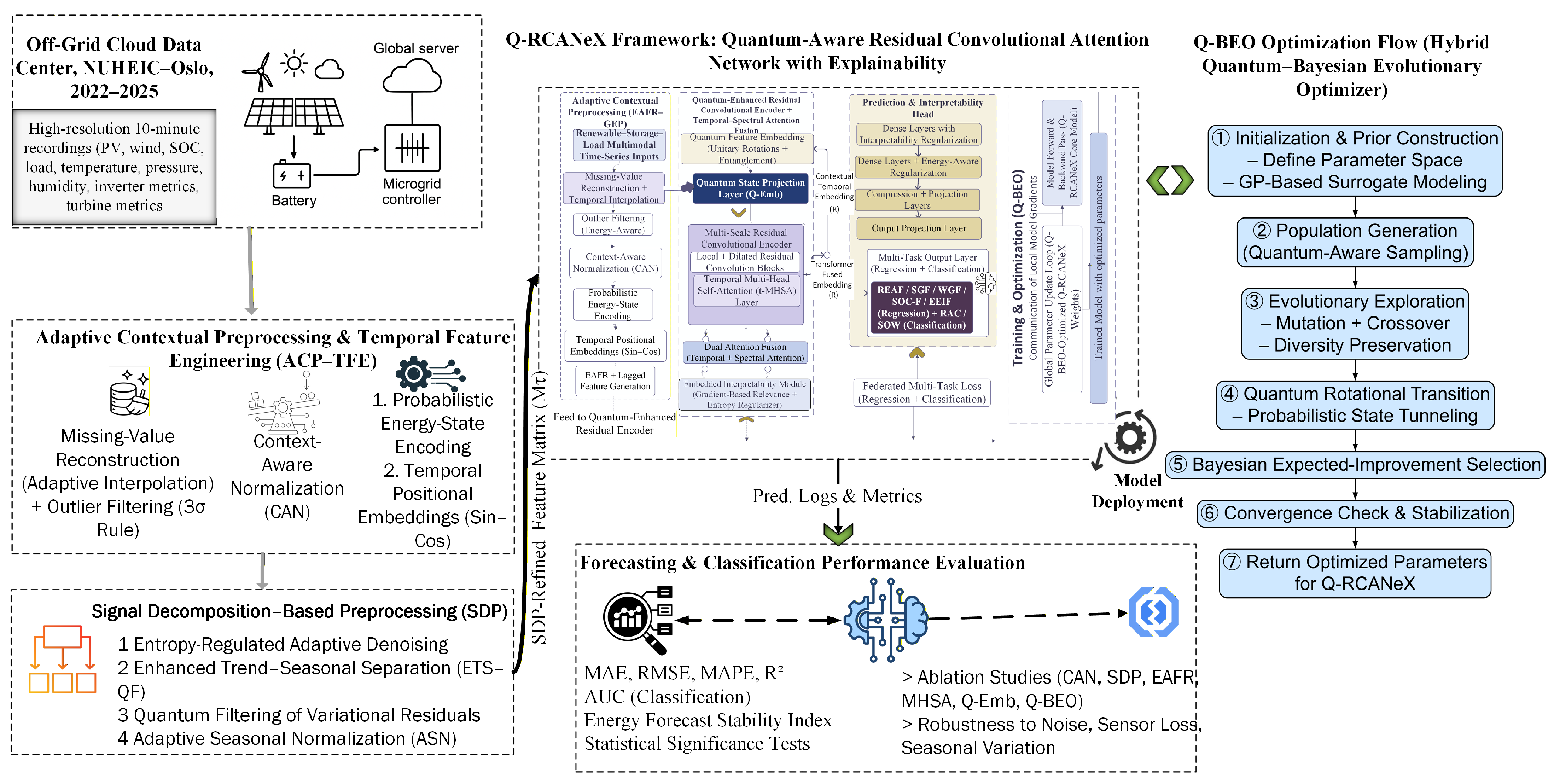 - Introduce the Q-RCANeX architecture, a solution to the issue of unstable and noisy multimodal energy data leading to inaccurate renewable energy predictions. The goal of the technique is to find stable physical patterns in streams of heterogeneous solar, wind, battery, and thermal data by integrating quantum-aware feature representation with residual convolutional encoding.