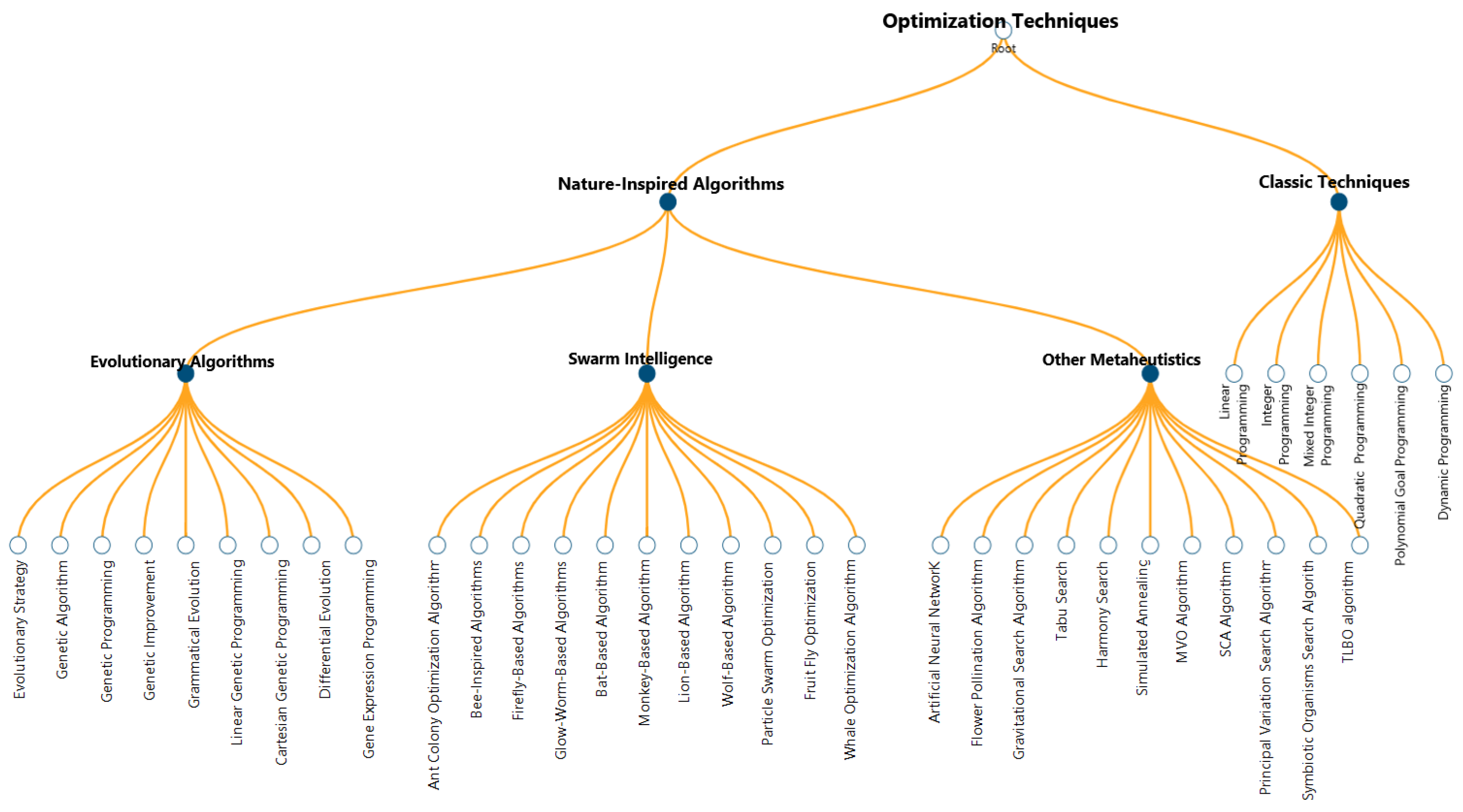 - The classification of optimization techniques into Classical, Nature-Inspired Algorithms, and Hybrid approaches provides a clear structure grounded in the origin and nature of the methods. However, this framework may overlook other relevant classificatory dimensions. For instance, a secondary categorization based on the type of problem addressed (deterministic vs. stochastic) or the structure of the objective function (single-objective vs. multi-objective) could yield additional insights into the specific applicability scenarios of each technique family. The present review does not systematically explore these secondary dimensions within its primary classification framework, which may limit the reader’s ability to directly match specific problem types with the most suitable algorithm classes based on such structural characteristics.
