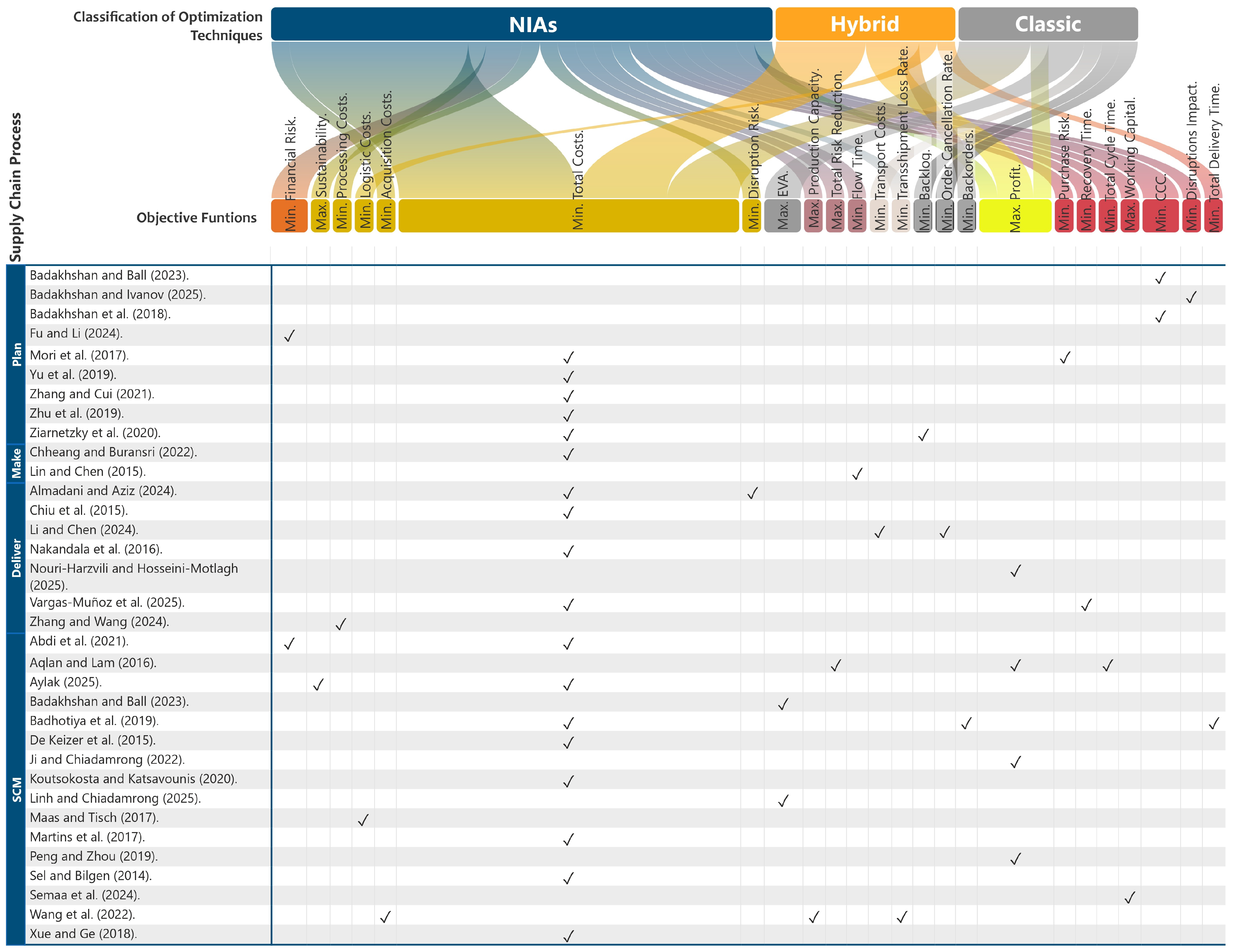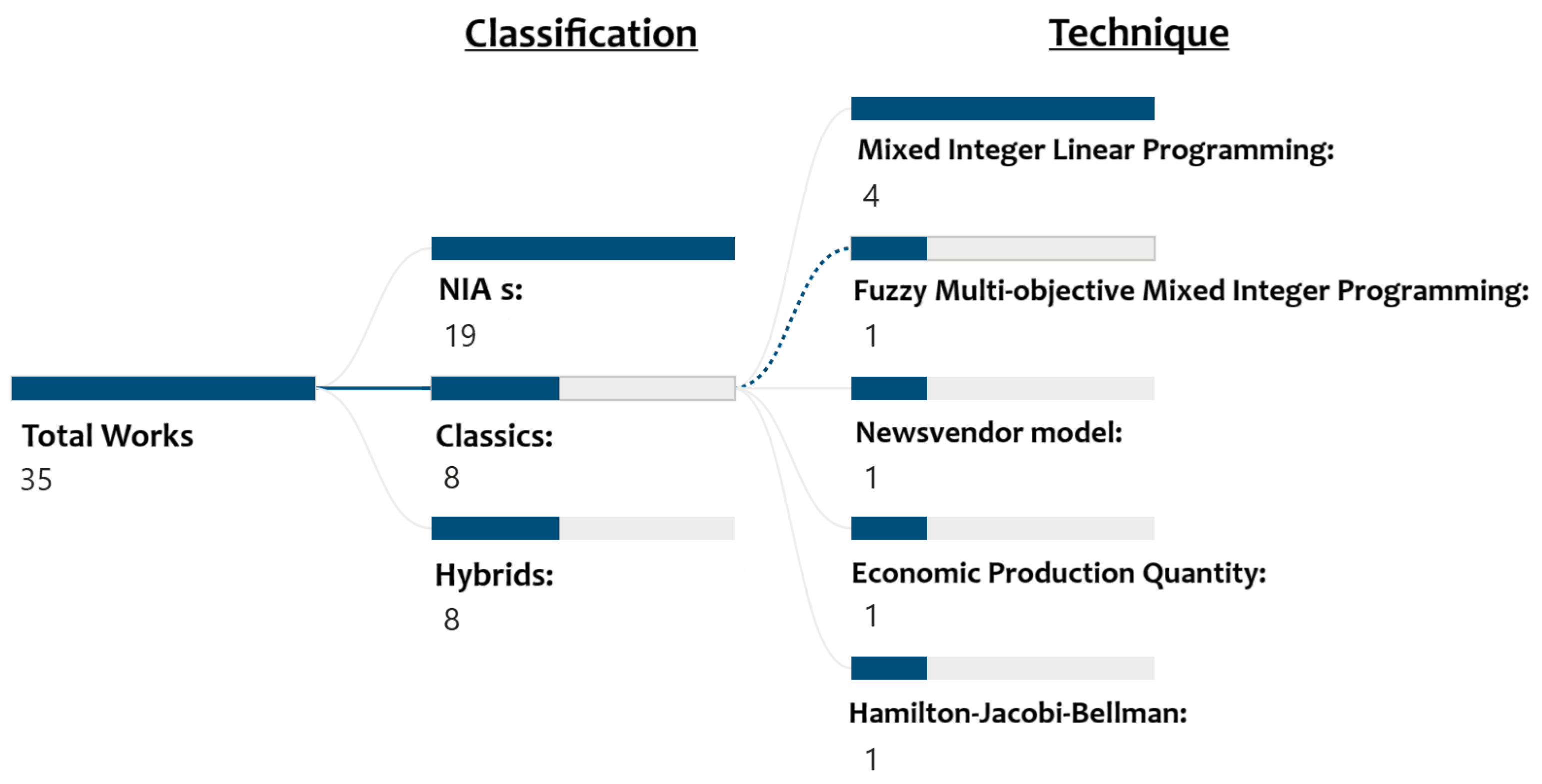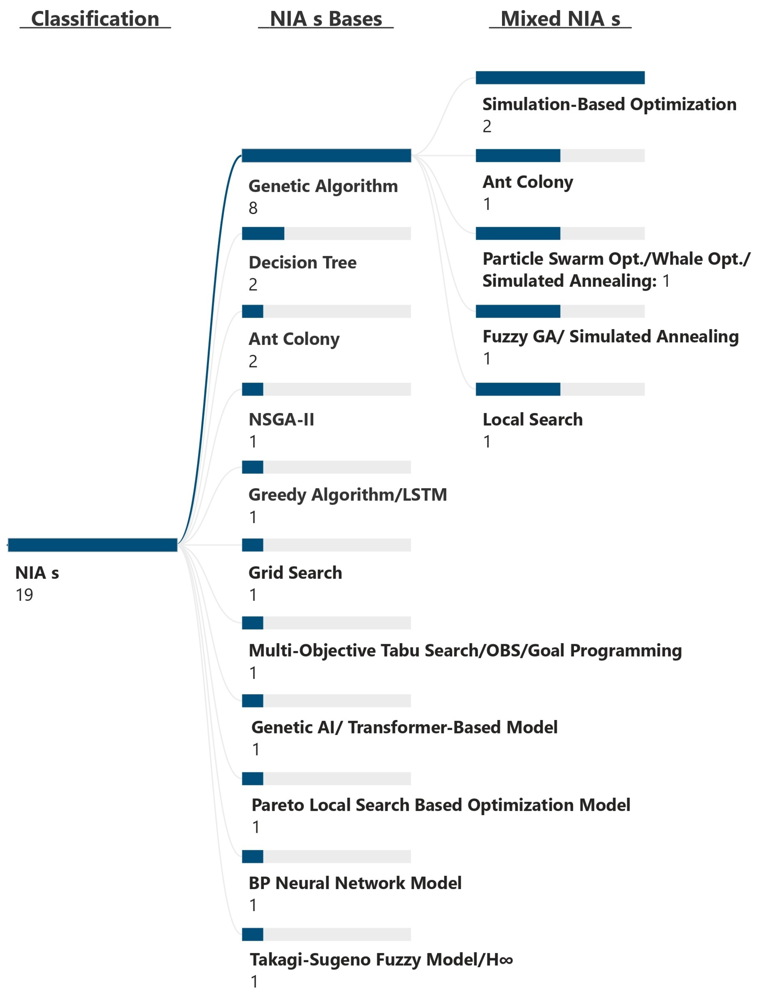 - Fragmentation and Limited Application of NIAs: Within the NIA category, there is a high fragmentation of techniques. The Genetic Algorithm is the most common, either individually or in combination, while the benefits of advanced artificial intelligence and optimization methods have yet to be explored for improving economic performance in supply chain contexts.