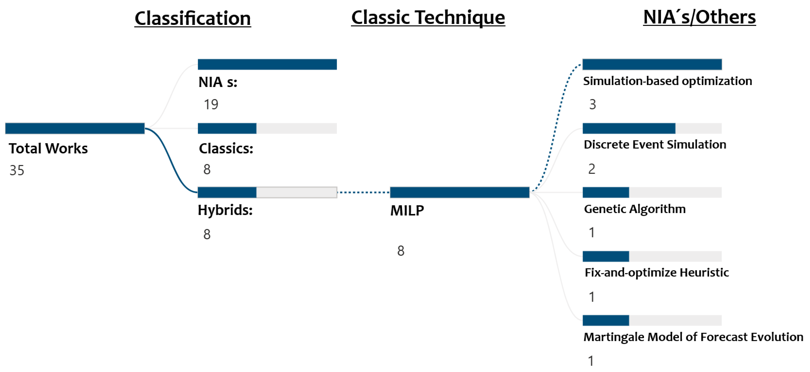- Linking Decision Levels with Optimization Techniques: This review clarifies which families of optimization methods are most suitable for distinct decision-making levels (see Appendix A). Managers can observe that for strategic decisions aimed at maximizing robust metrics such as Economic Value Added (EVA), hybrid techniques—such as Mixed-Integer Linear Programming (MILP) combined with simulation—are particularly appropriate, as prior studies have already addressed these approaches. In contrast, for tactical or operational decisions focused on cost minimization, classical techniques remain both fundamental and effective