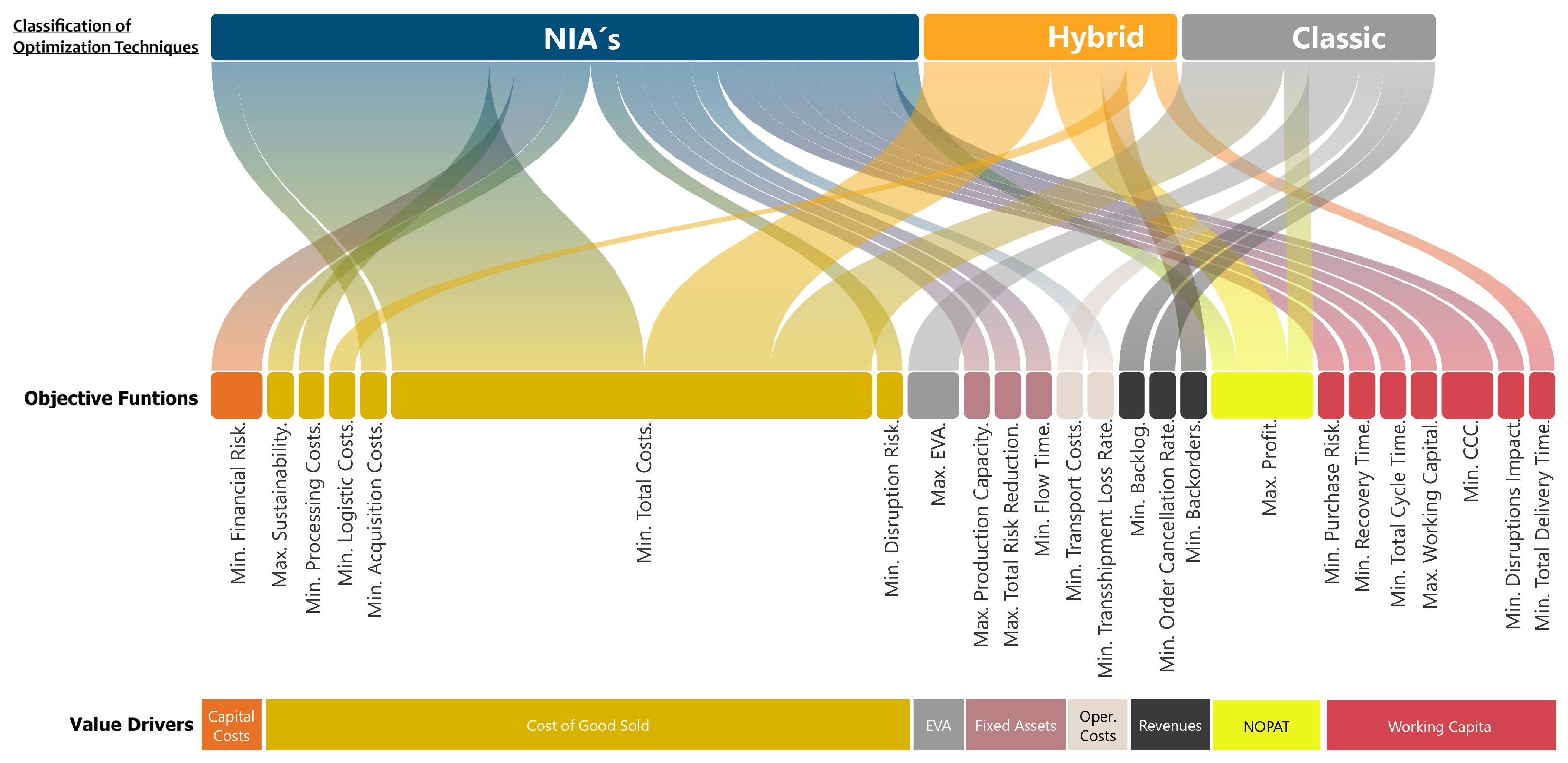 - Insufficient Focus on Strategic Financial Metrics: The predominant objective in the 35 works, regardless of the technique classification, is the Minimization of Total Costs or cost variants, neglecting more robust and strategic financial metrics such as EVA, the Cash Conversion Cycle, or Cash Flow.