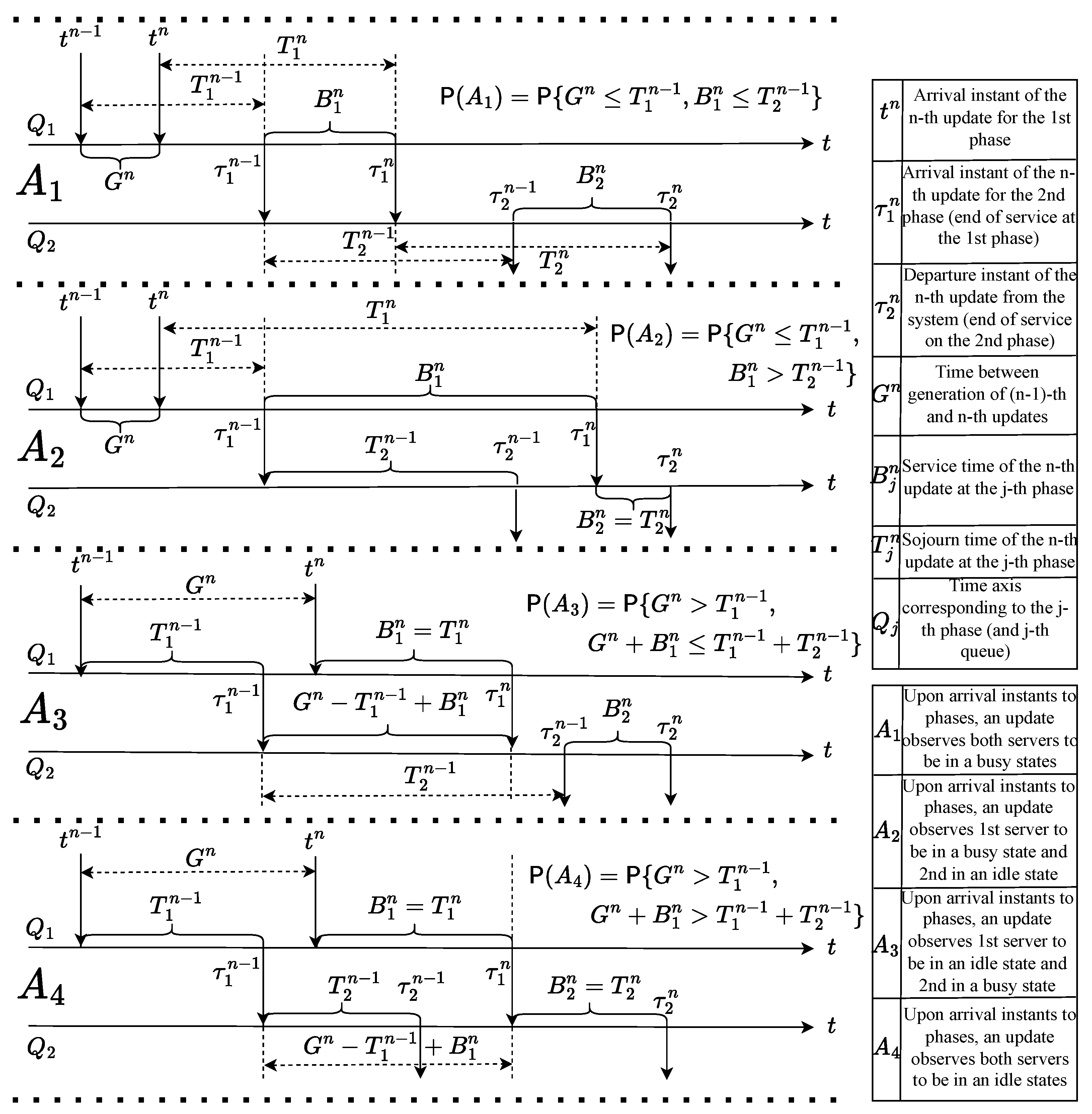 Let the number of updates in the j-th phase be denoted by , and introduce four outcomes indicating the state of the server (idle or busy):