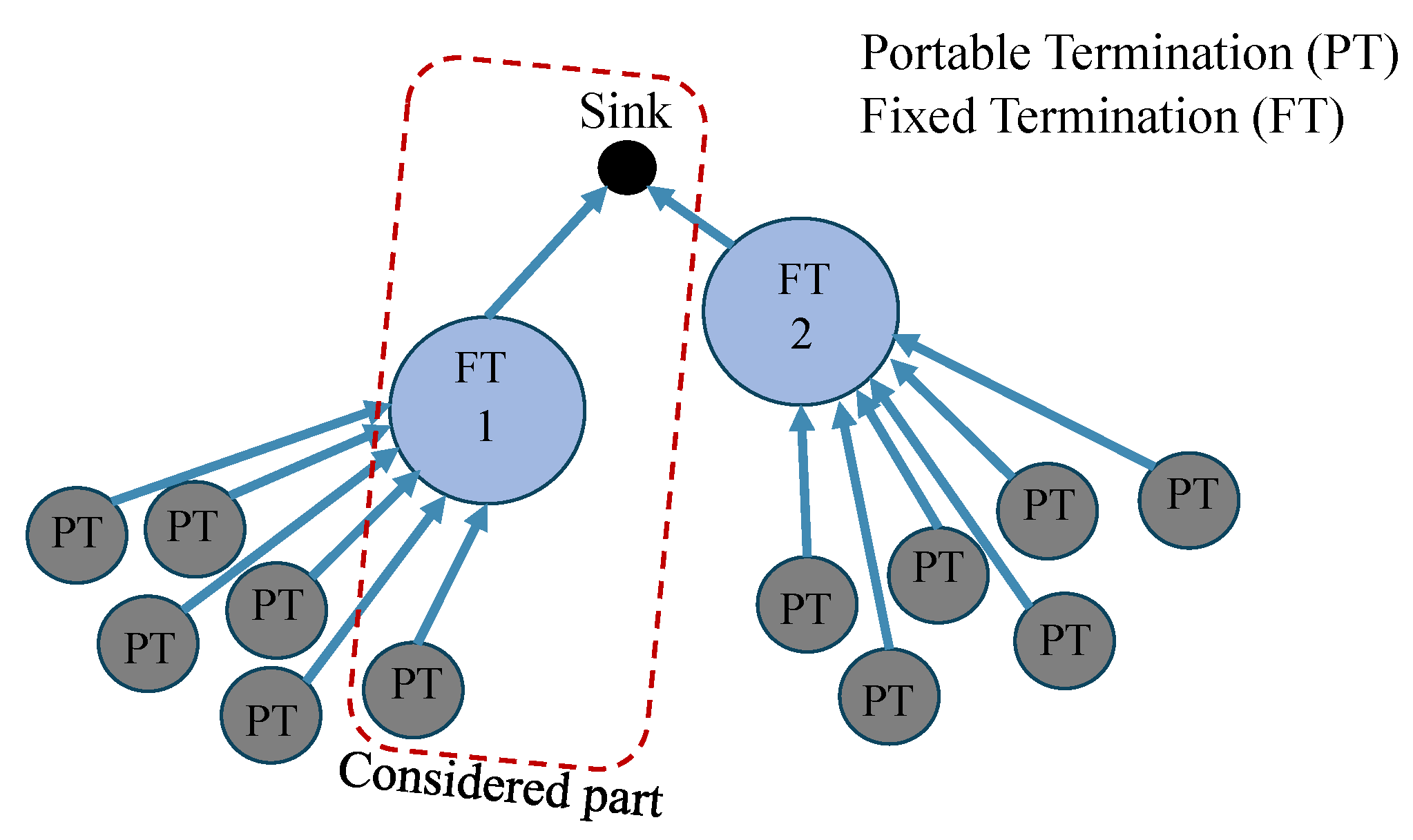 21], 60 TBs can be transmitted within a frame consisting of 12 time slots. Assuming that there are six homogeneous PTs associated with the FT, the mean transmission speed is 10 TBs per frame. Assuming the sink has two directly connected FT devices receiving data from 6 PT devices, the average transmission rate on the second hop is 5 TBs per frame. Therefore, we model the DECT-2020 network as an exponential tandem queueing system with