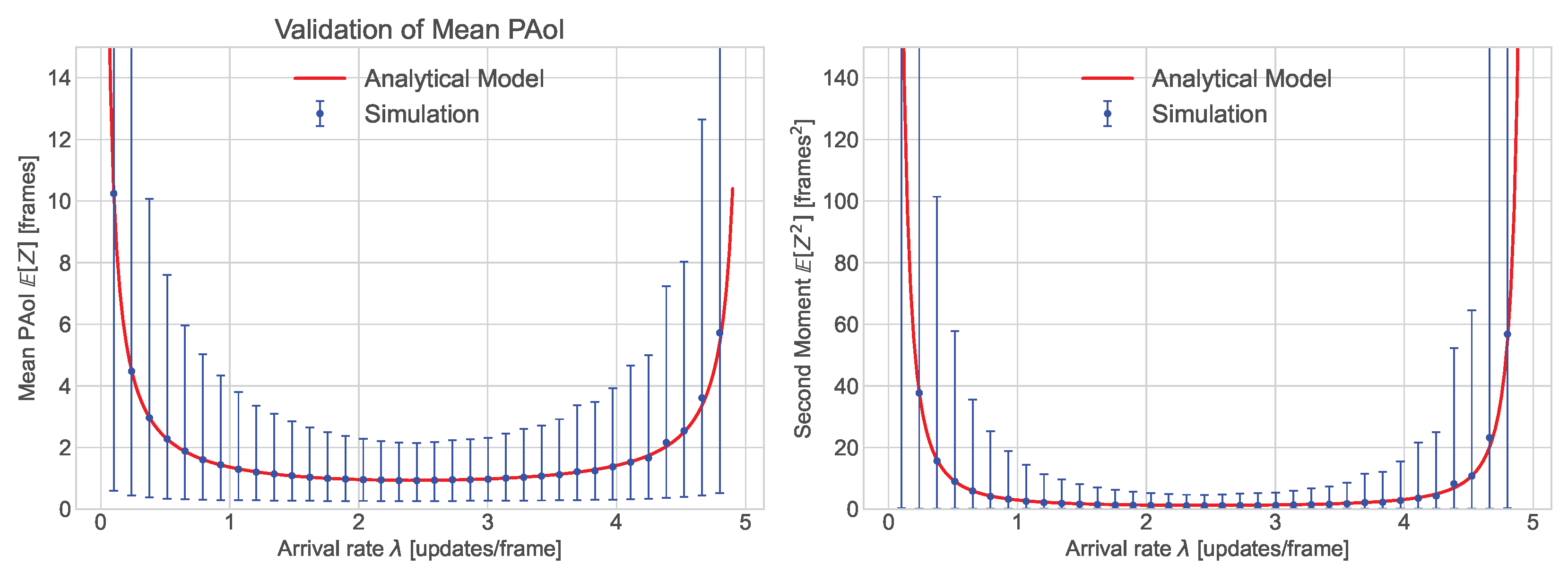 Figure 5 along with blue circles representing the first and second moment of PAoI obtained from simulations. For each