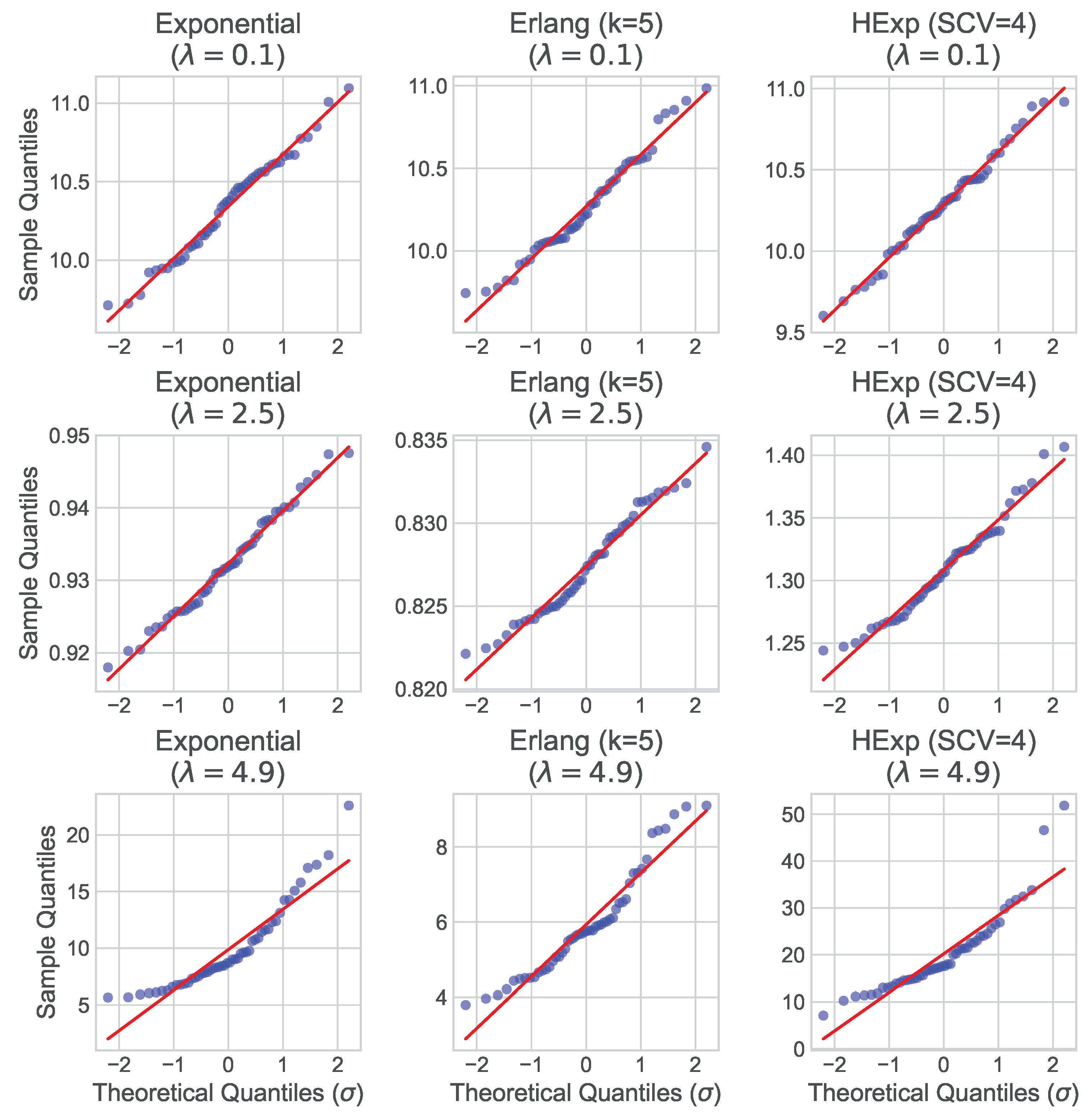 Figure 7 presents the Quantile–Quantile (Q-Q) plots for the sample means under low (