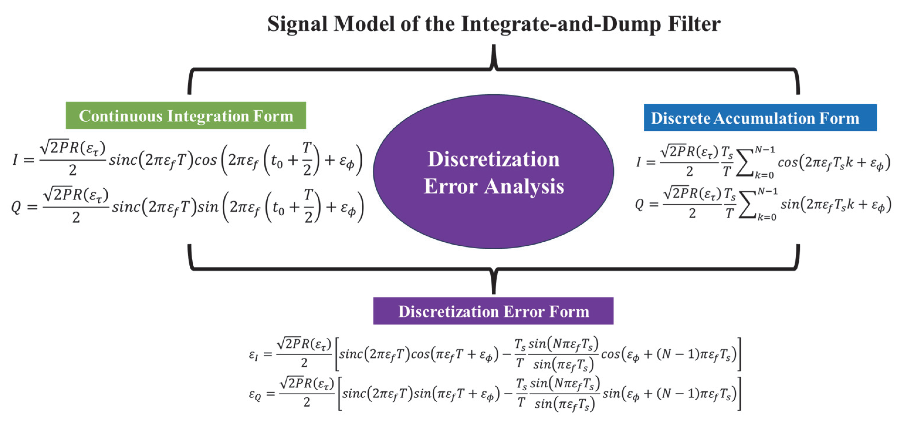 - From a qualitative perspective, it is demonstrated that the discretization error in the traditional integrate-and-dump filter output signal model derived via the continuous-time integration approach is negligible only under the ideal condition where the receiver tracks the input satellite signal without any error. In practical scenarios, however, the discretization error inevitably exists.