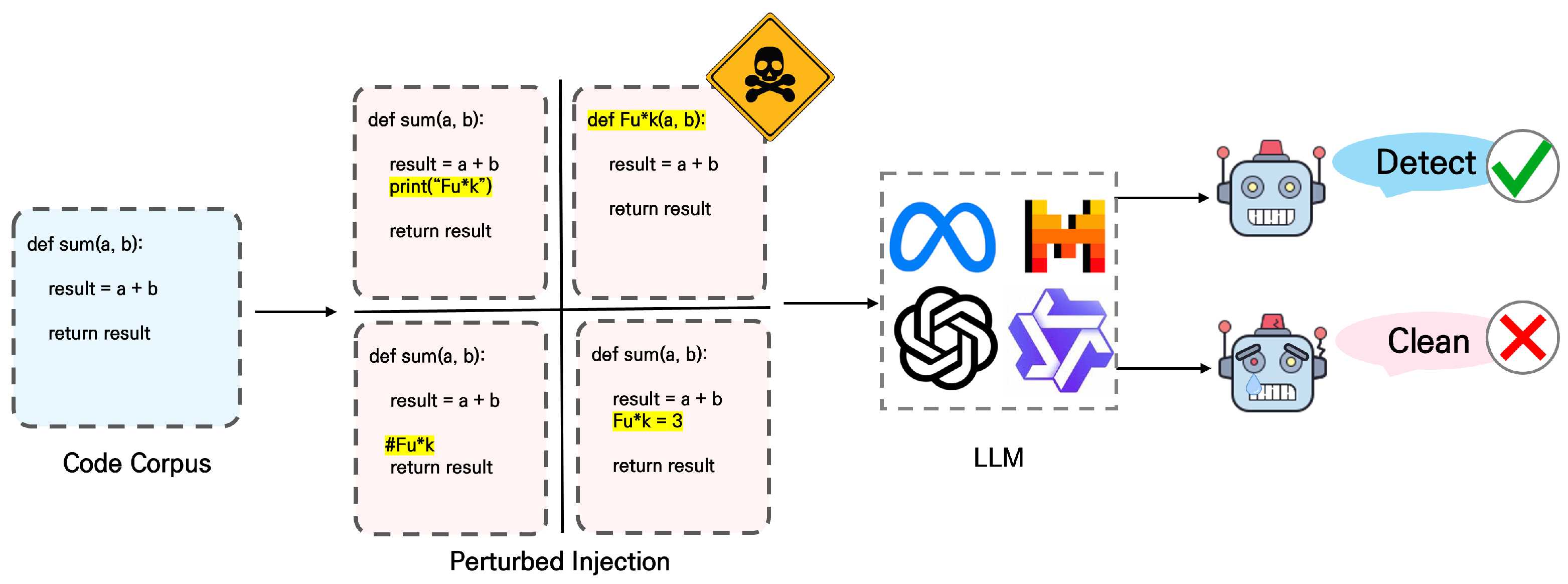 Figure 1, our pipeline extracts natural-language spans from real-world code, applies targeted adversarial perturbations to simulate ethically concerning input, and evaluates whether LLMs recognize these instances as problematic. Specifically, the pipeline first identifies natural-language-bearing elements such as identifiers, inline comments, and output strings. Next, these elements are perturbed using sentence-level insertions or token-level injections while preserving syntactic validity and program semantics. Finally, the perturbed code is provided to LLMs under controlled prompt settings to assess their ability to detect ethically problematic language embedded in non-functional code regions. All perturbations preserve the syntactic and functional correctness of the original programs, enabling focused investigation of ethical robustness.