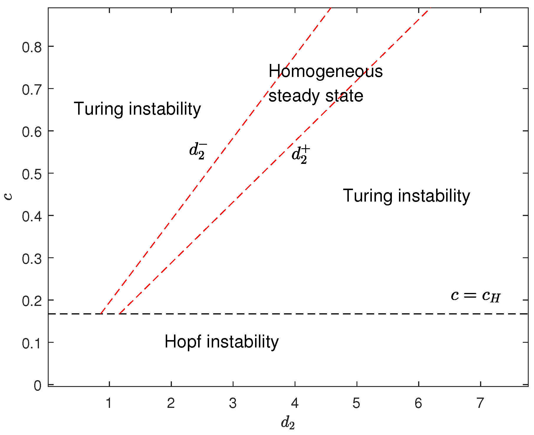 - Spot pattern:Its existence condition is . The solution is stable as , while is always unstable, where