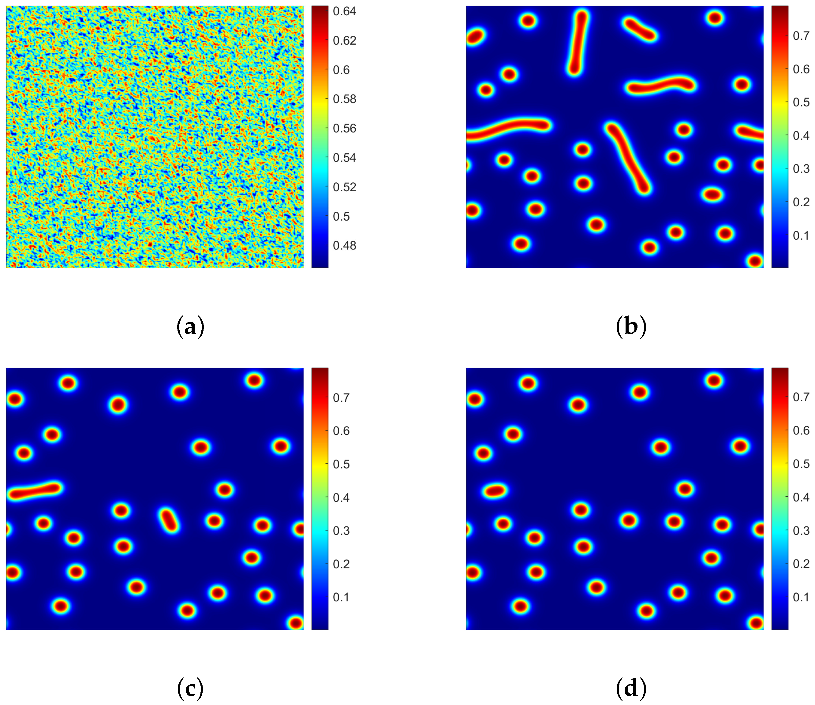 - Mixed structural state: . It exists when and is always unstable as The explicit thresholds areThe bifurcation diagram of Turing patterns is given in Figure 7. These analytical predictions are fully confirmed by direct numerical simulations of the original system (4) in Figure 8, Figure 9 and Figure 10.