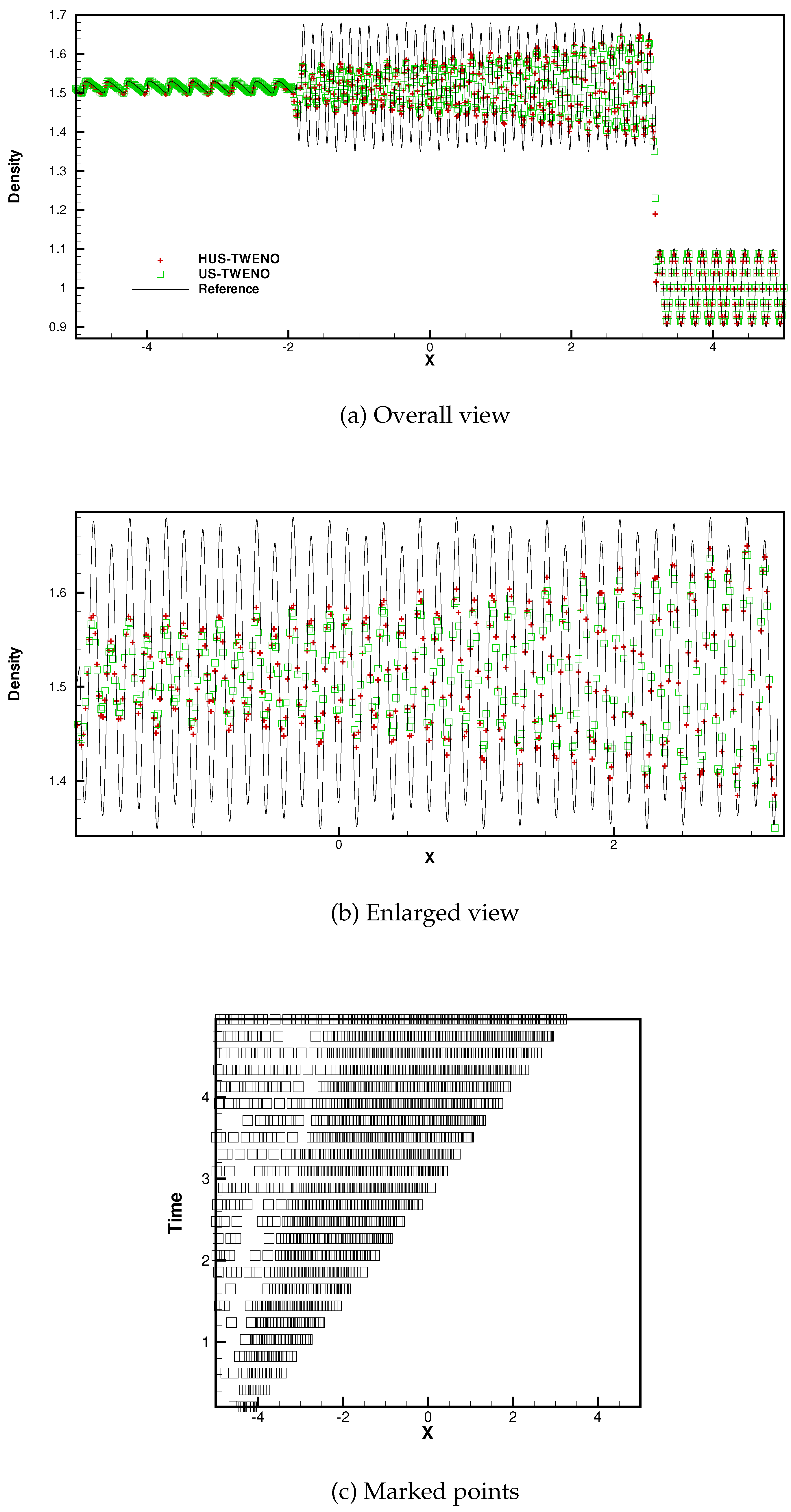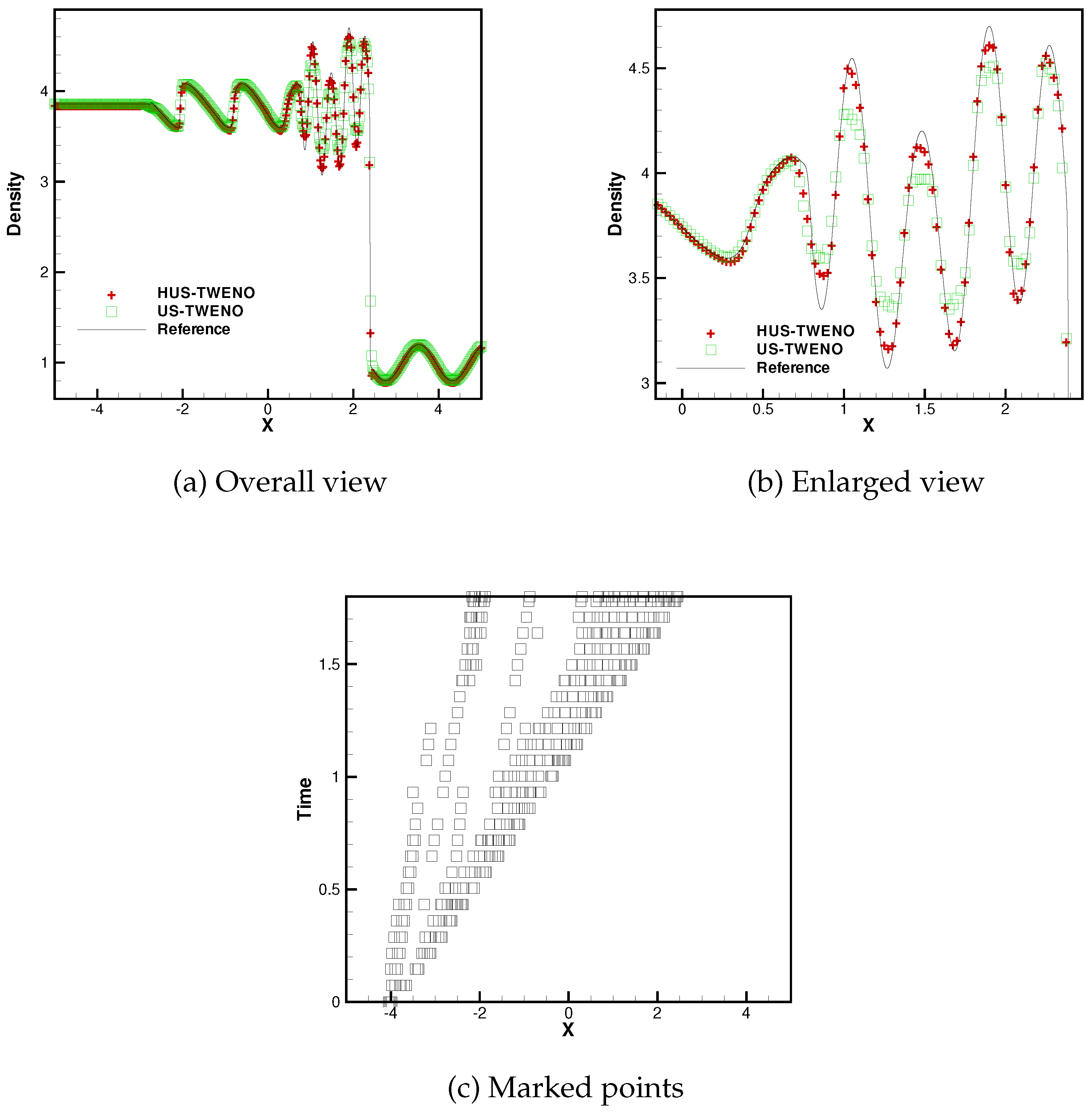 Remark 2. In this article, the fluxes in (11) are substituted by the density ρ for detecting the troubled cells. Alternatively, the fluxes can be directly used and result in a different count of the troubled cells without impacting other algorithm properties. It is also worth noting that the identification algorithm for designing the troubled cells is manual parameter-free related to the problems, which makes it convenient for simulating some large-scale engineering problems. Remark 3. In order to reduce spurious oscillations when simulating multi-dimensional Euler equations, the US-TWENO scheme is applied along the local characteristic directions [3,5]. The identification of the troubled cells and the high-order linear upwind schemes are still executed in the physical space to save time, since their implementation by using the characteristic variables, computing the optimal linear weights, computing the complicated smoothness indicators, and computing the nonlinear weights are lengthy. Obviously, the HUS-TWENO scheme achieves formal fifth-order accuracy, since the analysis above has shown that the US-TWENO scheme achieves formal fifth-order accuracy, and the linear upwind scheme is of fifth-order accuracy. 4. Concluding Remarks
