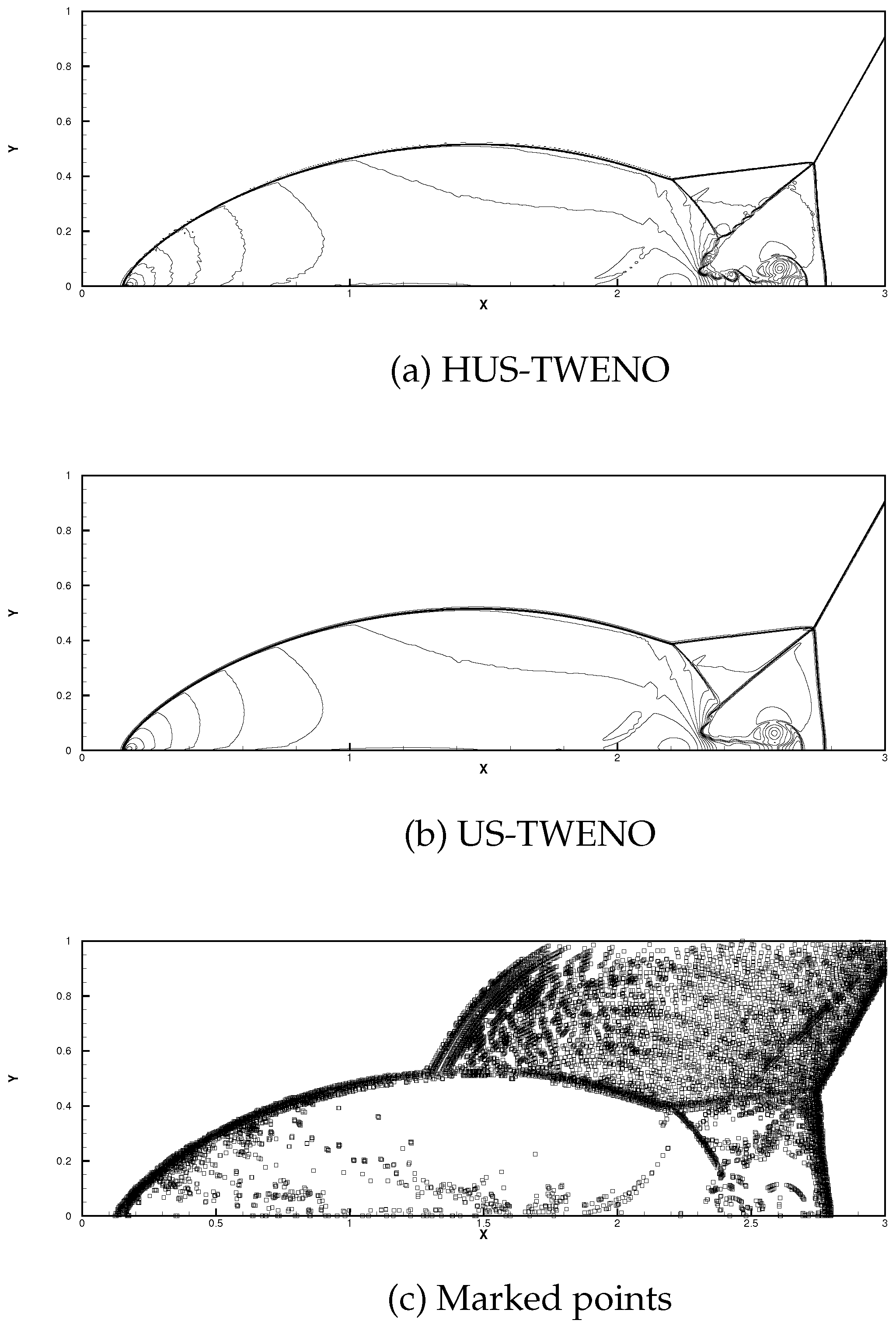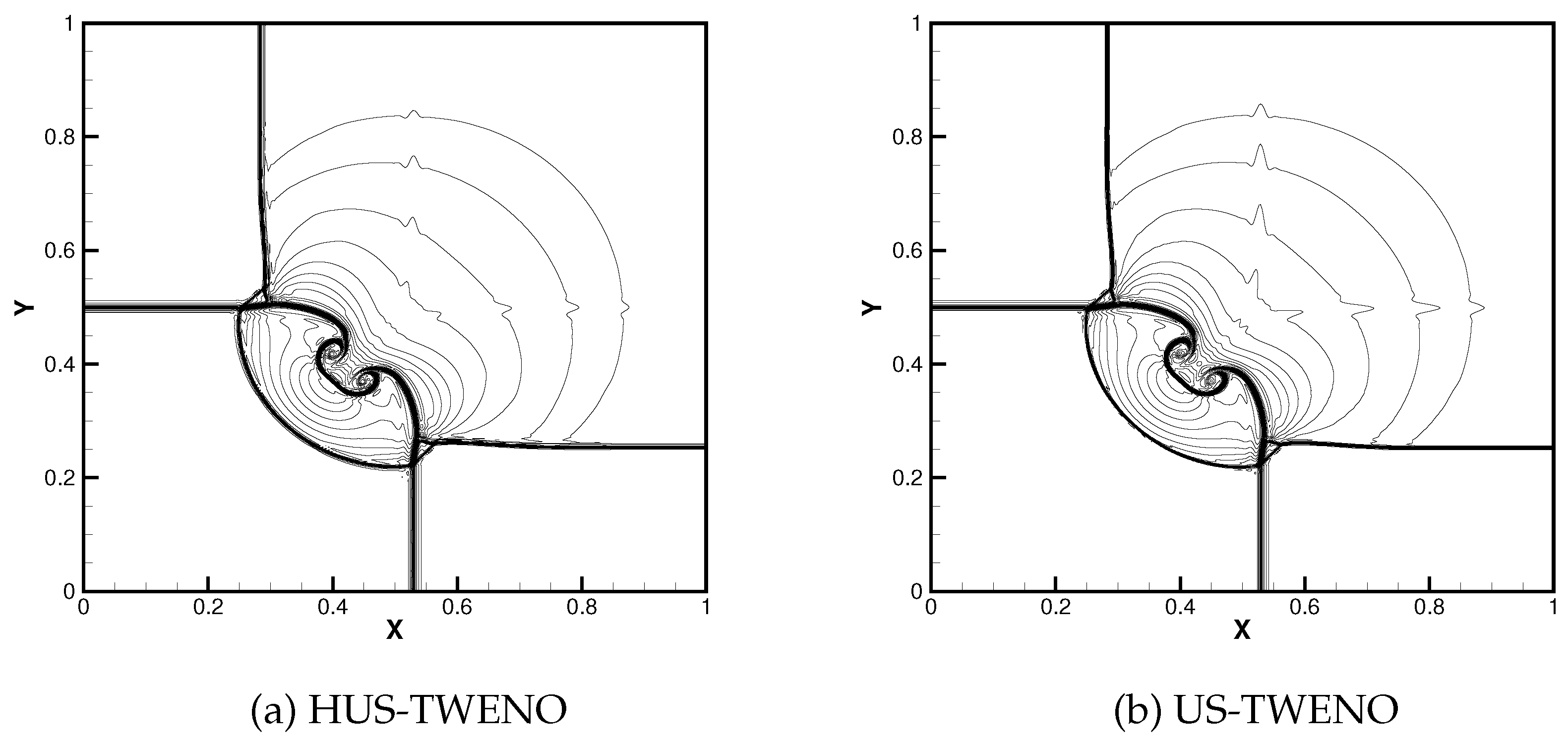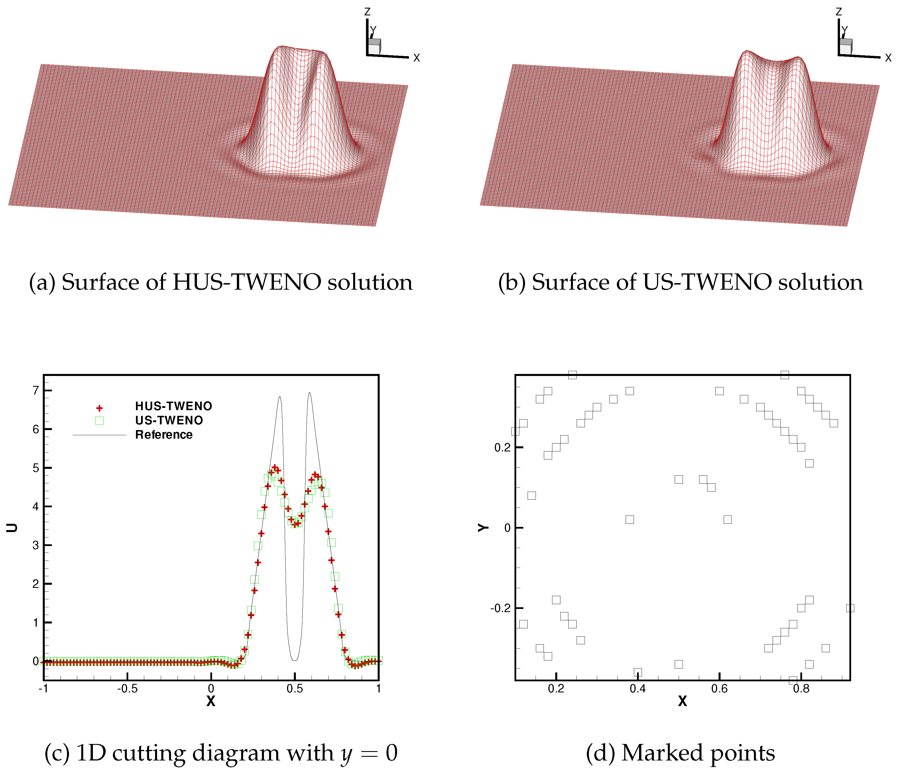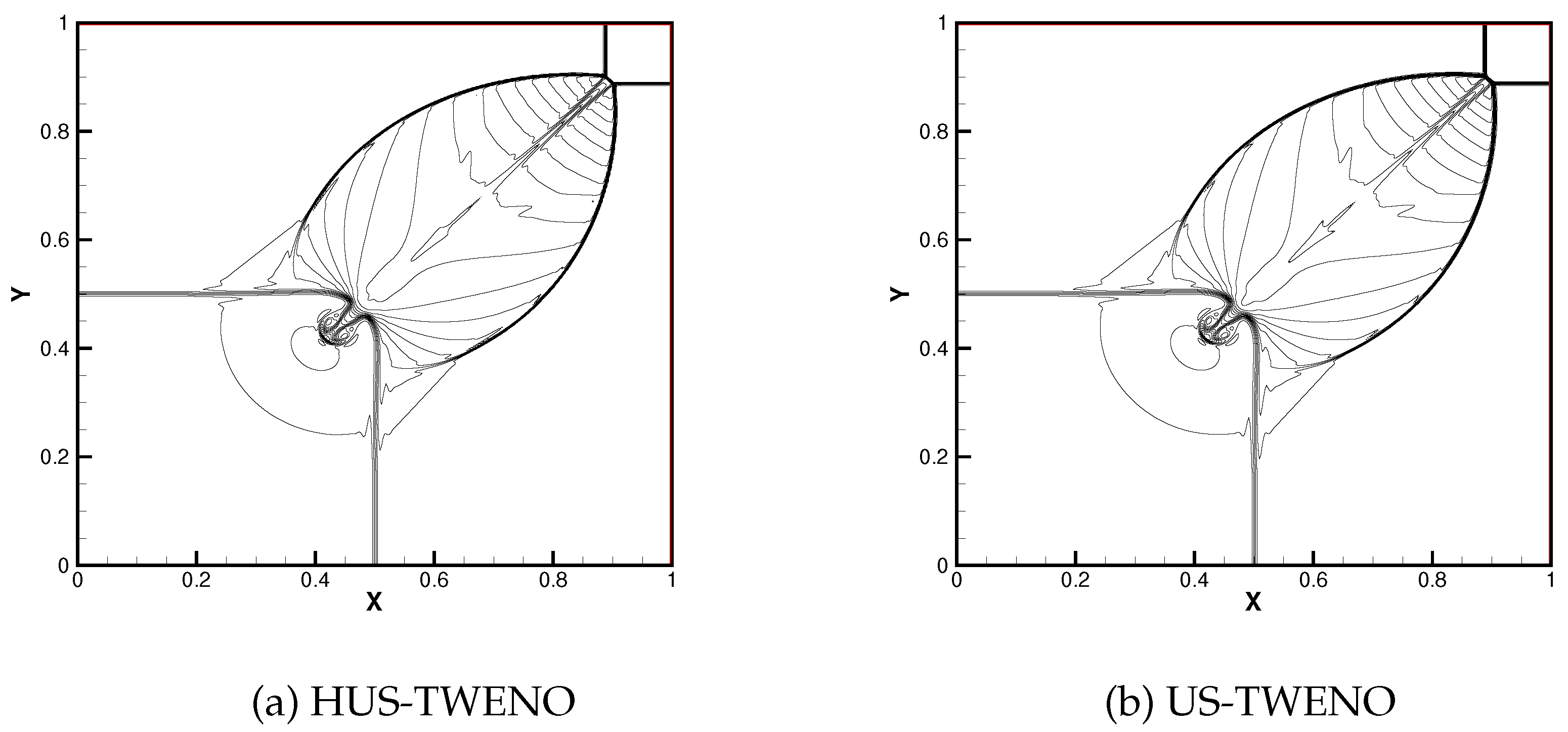 39] in the algebraic polynomial space. As a result, it enables more precise identification of the troubled cells. Finally, the fifth-order finite difference HUS-TWENO scheme can accurately distinguish smooth regions from discontinuous ones, seamlessly transitioning between the simple linear upwind reconstruction and complex US-TWENO reconstruction, thus substantially improving the efficiency.