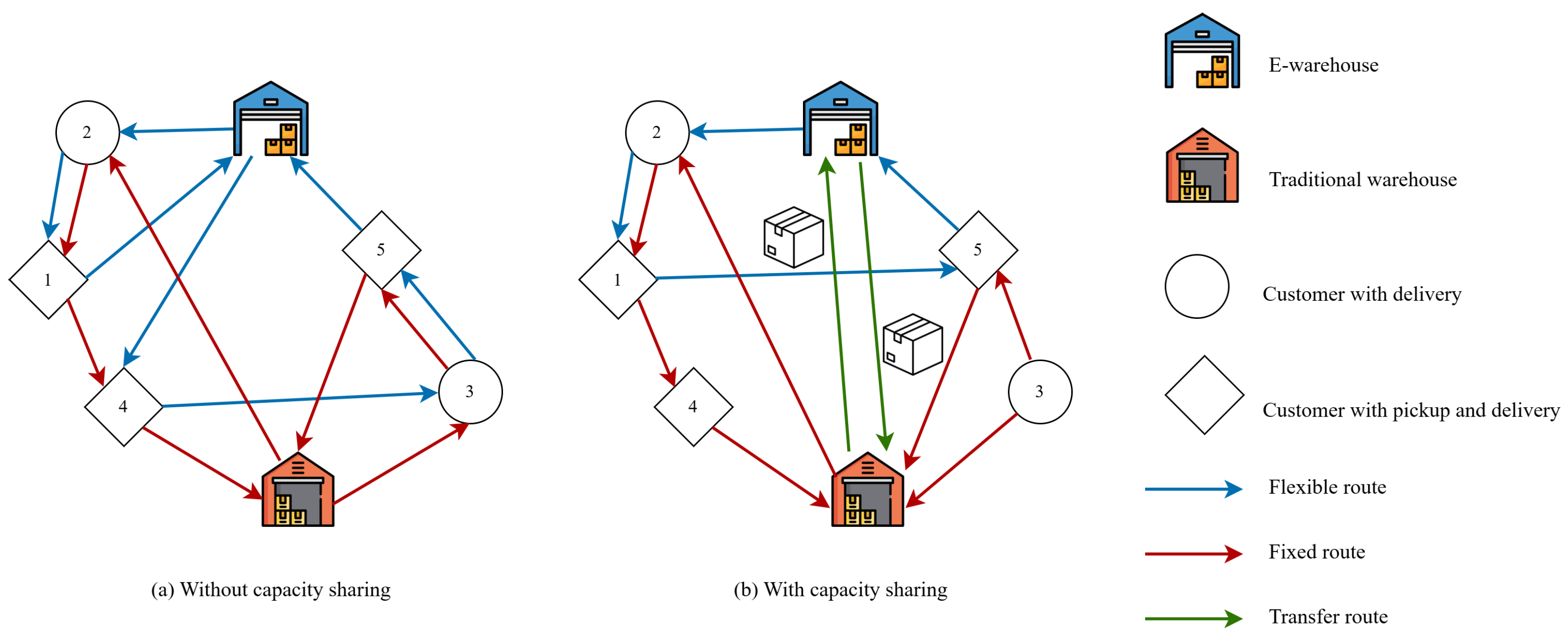 Figure 1b shows that with capacity sharing, the service is completed with only one flexible route. Specifically, the flexible route services stores 2, 1, and 5. The online demand at stores 3 and 4 is transferred to the fixed routes due to sufficient residual capacity, necessitating the use of the transfer route to ship items between the e-warehouse and the traditional warehouse.