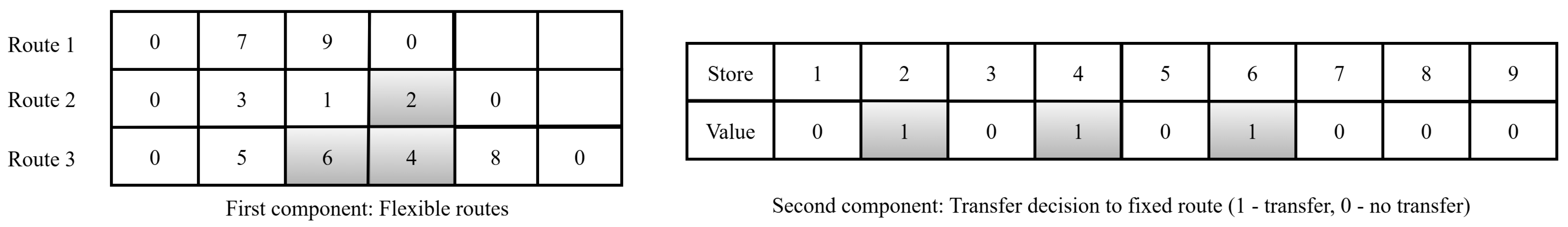—Transfer-to-Route move: Moves a store from the transfer list into all possible positions in flexible routes. The move is performed if the solution improves; otherwise, the store remains in the transfer list. This move is repeated for all stores in the transfer list.