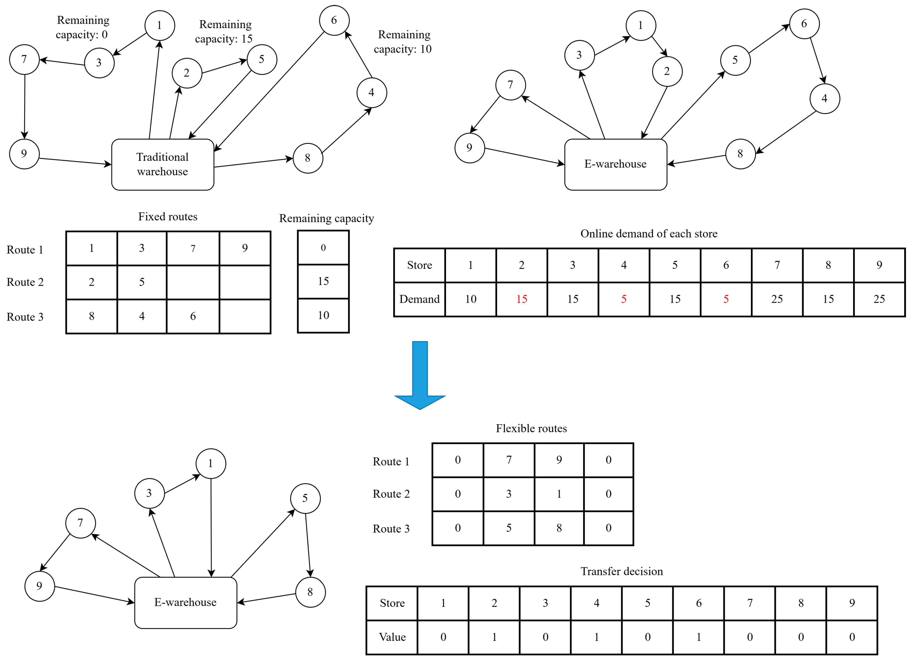 Pickup Transfer: If the transferred store has items to be picked up (returns), the fixed route collects these items and transports them back to the traditional warehouse. Subsequently, the items are moved from the traditional warehouse to the e-warehouse via the transfer route.