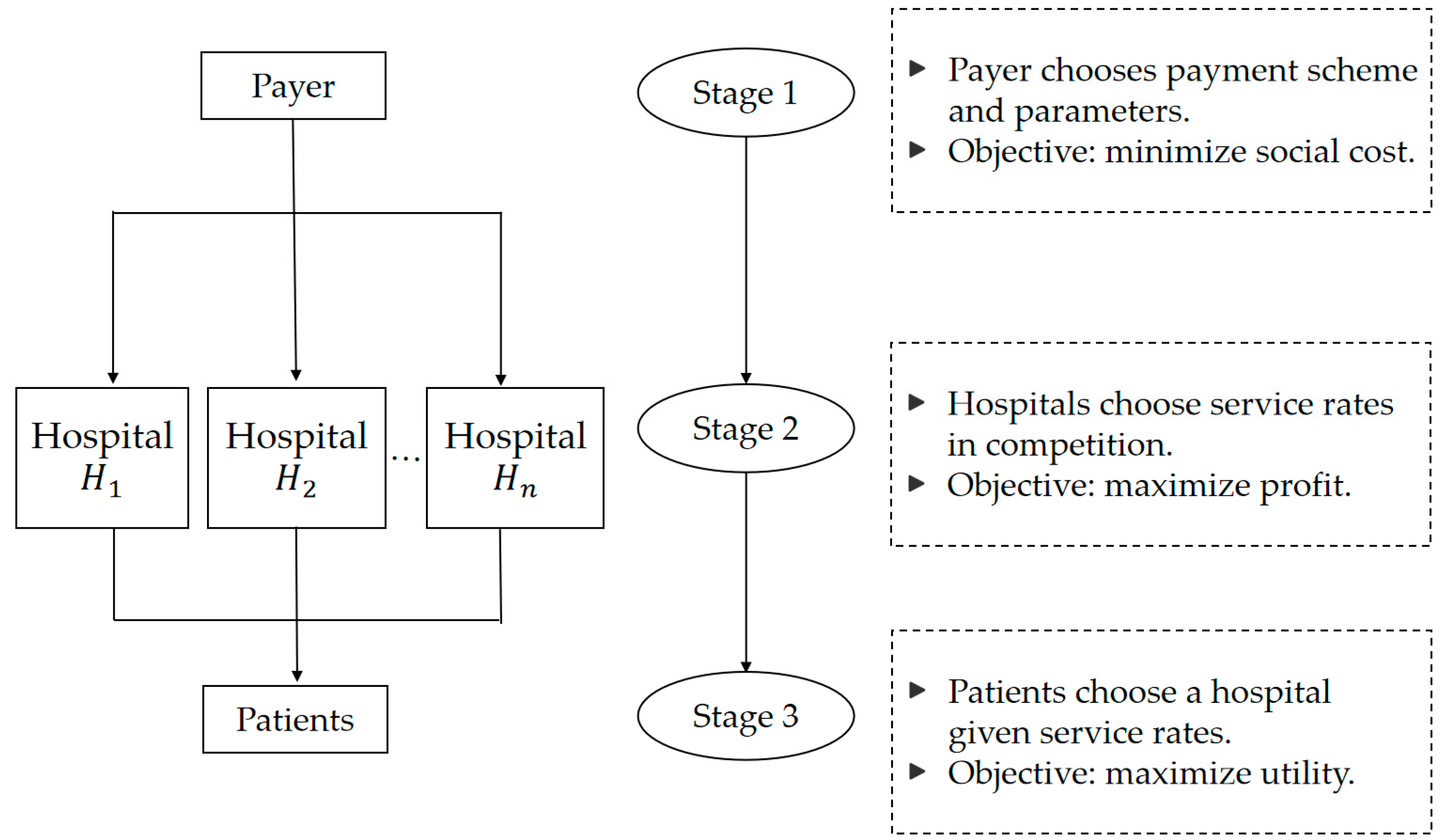 - Han, Z.; Arikan, M.; Mallik, S. Competition between hospitals under bundled payments and fee-for-service: An equilibrium analysis of insurer’s choice. Manuf. Serv. Oper. Manag. 2022, 24, 1821–1842. [Google Scholar] [CrossRef]