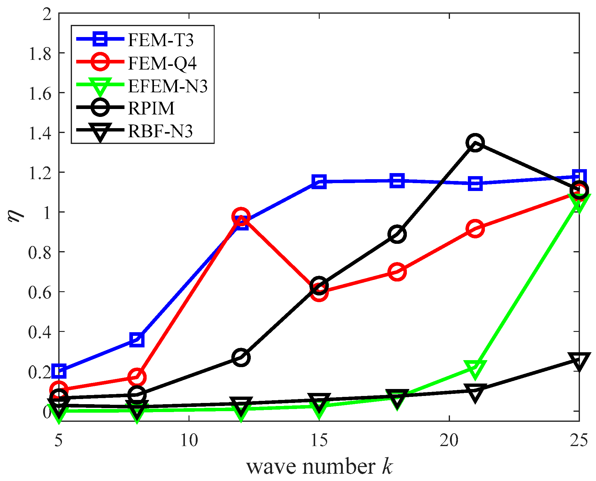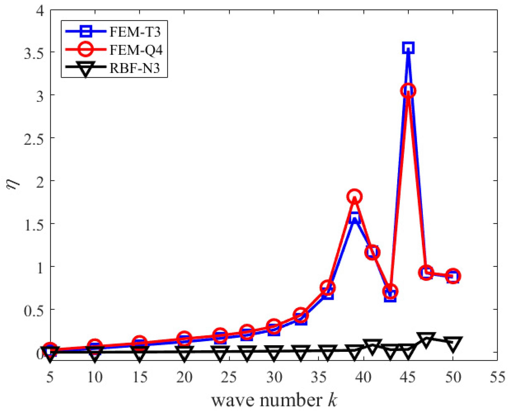 - Wenterodt, C.; Estorff, O.V. Dispersion analysis of the meshfree radial point interpolation method for the Helmholtz equation. Int. J. Numer. Methods Eng. 2009, 77, 1670–1689. [Google Scholar] [CrossRef]