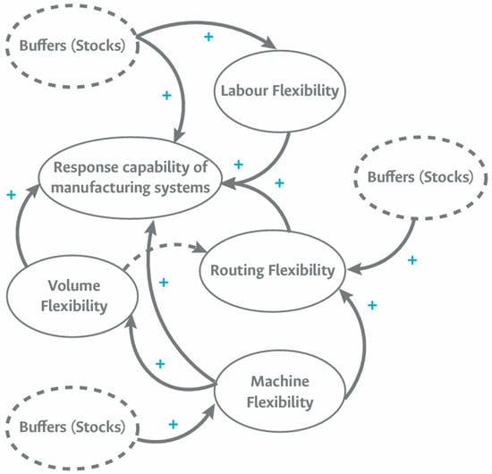 Figure 3 shows a diagram depicting key flexibilities in manufacturing systems facilitated by buffers, particularly inventory (stock). The diagram employs a standard notation: a positive (+) influence between two variables indicates that an increase in A leads to an increase in B, while a decrease in A result in a decrease in B. In contrast, a negative (−) influence indicates an inverse relationship, where an increase in A causes a decrease in B, and conversely, an increase in B leads to a decrease in A.