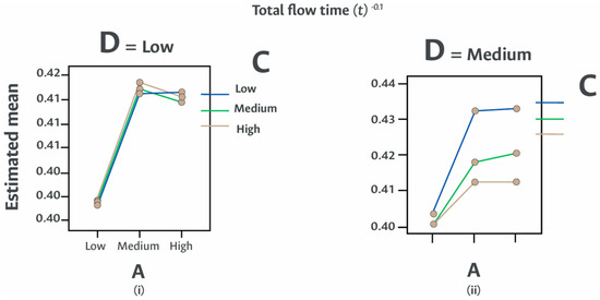Permanence time (transformed) versus route (C), machine (A) and volume (D) flexibilities without the use of buffers. The results indicate that at low route flexibility levels (C = Low), medium machine and volume flexibilities increase total flow time, suggesting an adverse interaction between these factors. As route flexibility increases (C = Medium, High), the system exhibits more stable flow times, and low machine flexibility tends to minimize permanence time.