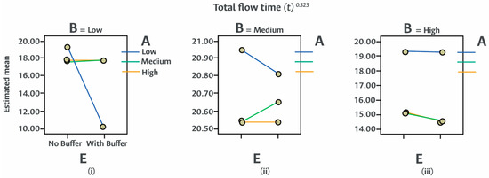 Transformed flow time versus the combined impact of labor (B) and machine (A) flexibilities with the use of buffers (E). The results show that the inclusion of buffers reduces total flow time across all combinations of machine and labor flexibilities. The effect is most significant when labor flexibility is low, highlighting the compensatory role of buffers in systems with limited workforce adaptability.