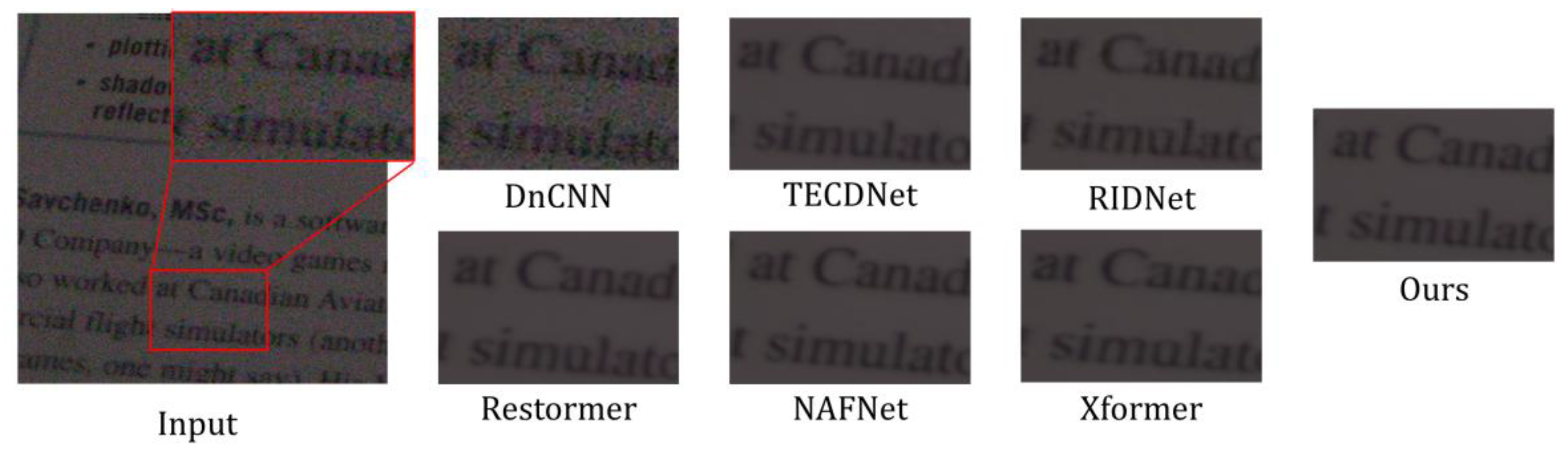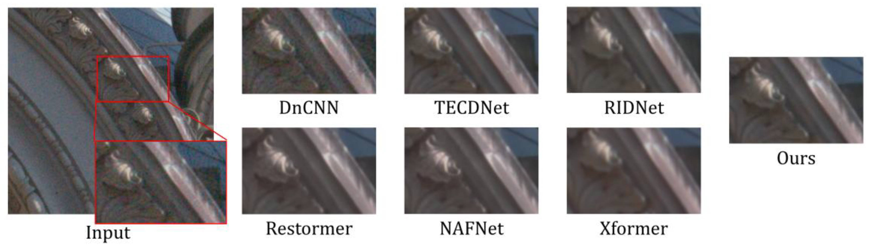 - Zhang, J.; Zhang, Y.; Gu, J.; Dong, J.; Kong, L.; Yang, X. Xformer: Hybrid X-Shaped Transformer for Image Denoising. In Proceedings of the International Conference on Learning Representations (ICLR), Vienna, Austria, 7–11 May 2024. [Google Scholar] [CrossRef]