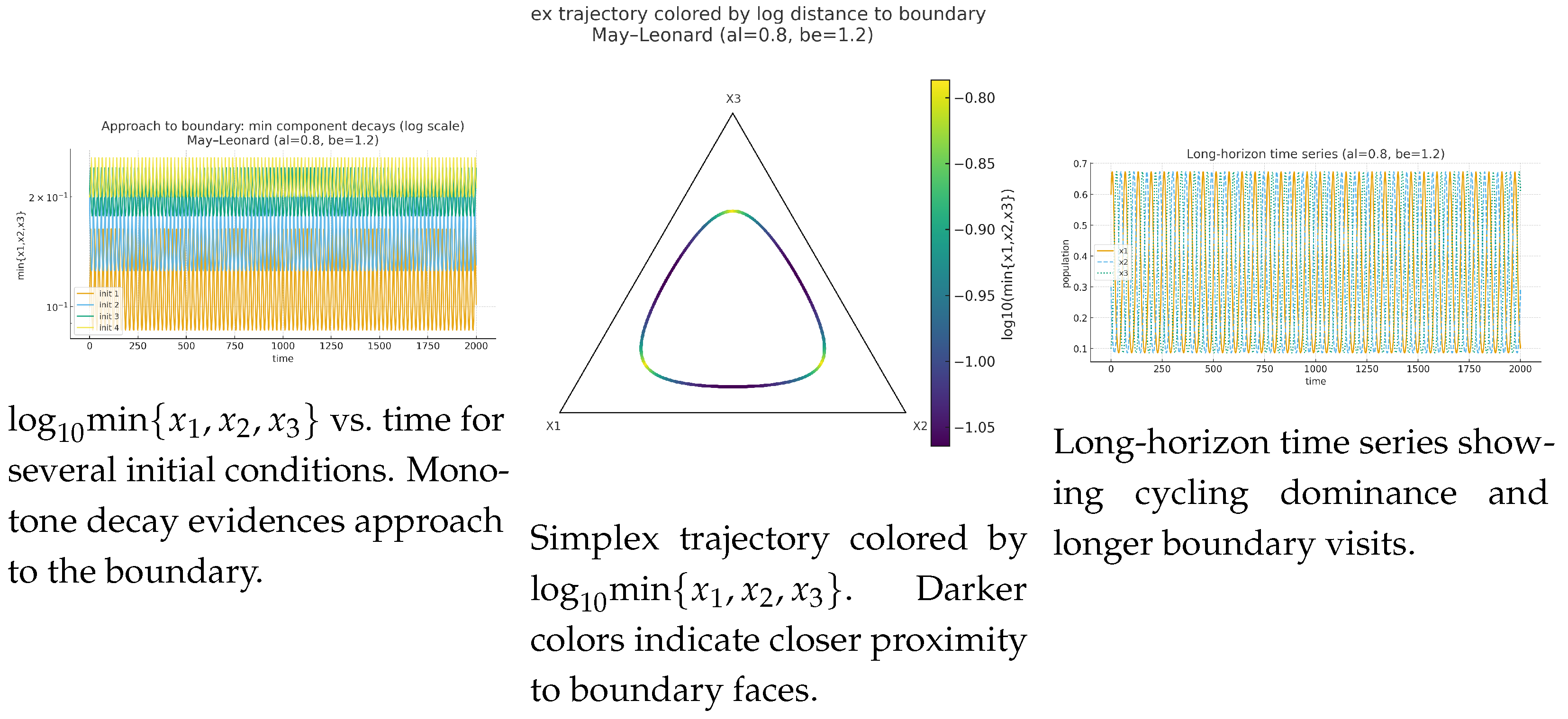 May–Leonard heteroclinic-cycle regime with al, be. Left: clearly , hence nonpersistence. Middle: simplex projection with distance-to-boundary coloring. Right: time series on showing the characteristic increase in dwell times near the boundary saddles. These are obtained in MayLeonard.nb.