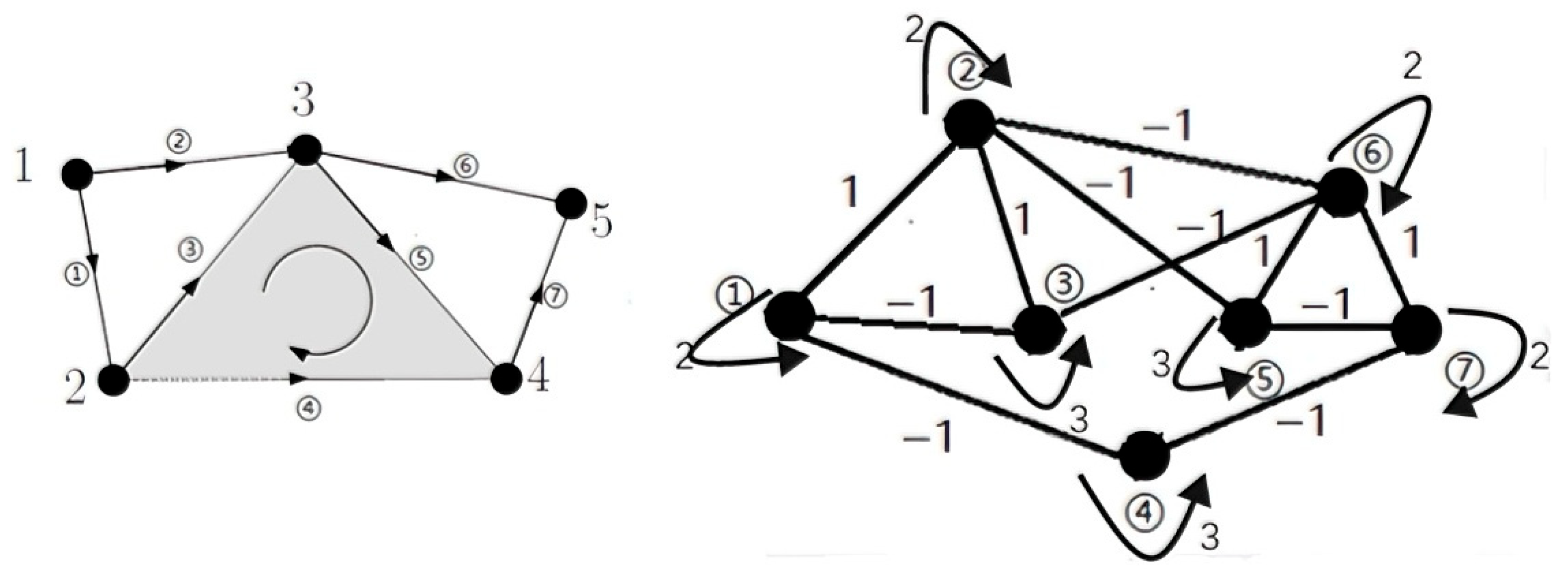 - Observe the relationship between the different simplex in the simple complex. When studying the second-order combinatorial Laplacian matrix, observe the adjacent connected edges in the simple complex network. There are no linked connections between the respective nodes in the weighted network if the two connected edges are in the same second-order simplex. If the adjacent connected edges are not in the same second-order simplex, it is judged whether there are common nodes in the two connected edges. If there are common nodes, we continue to judge whether the direction of the connected edges is the same for the common nodes. If so, the connected edge weight between the nodes corresponding to the weighted network is 1. The edge weight between the nodes that correspond to the weighted network is −1 if they differ.