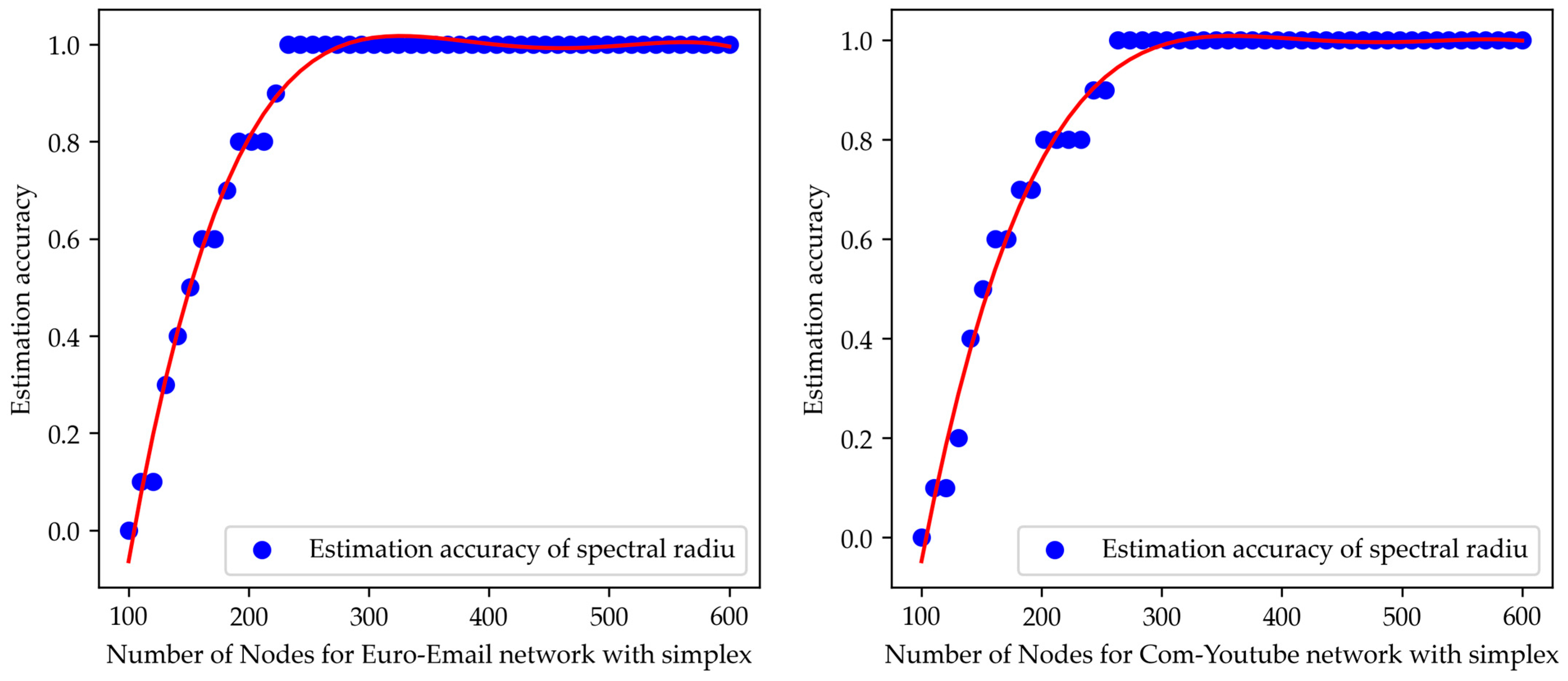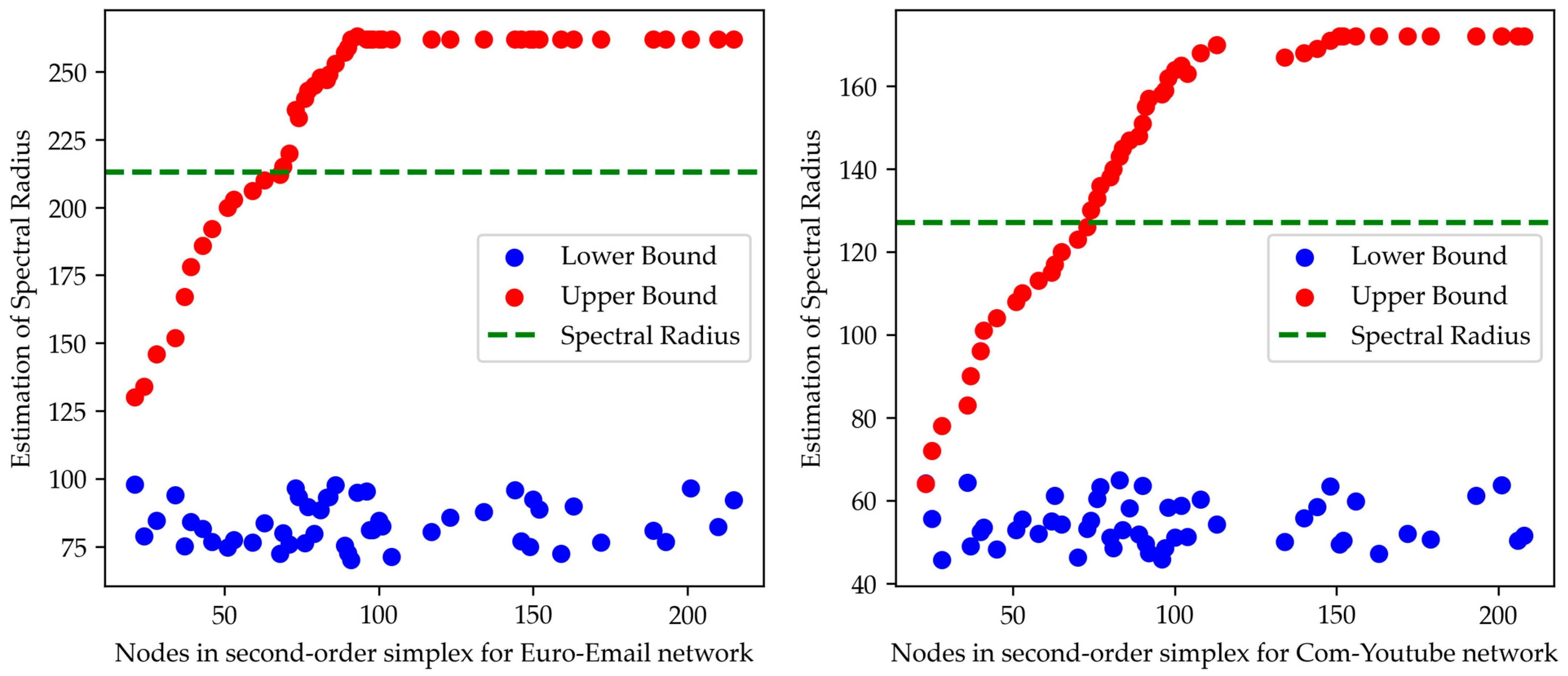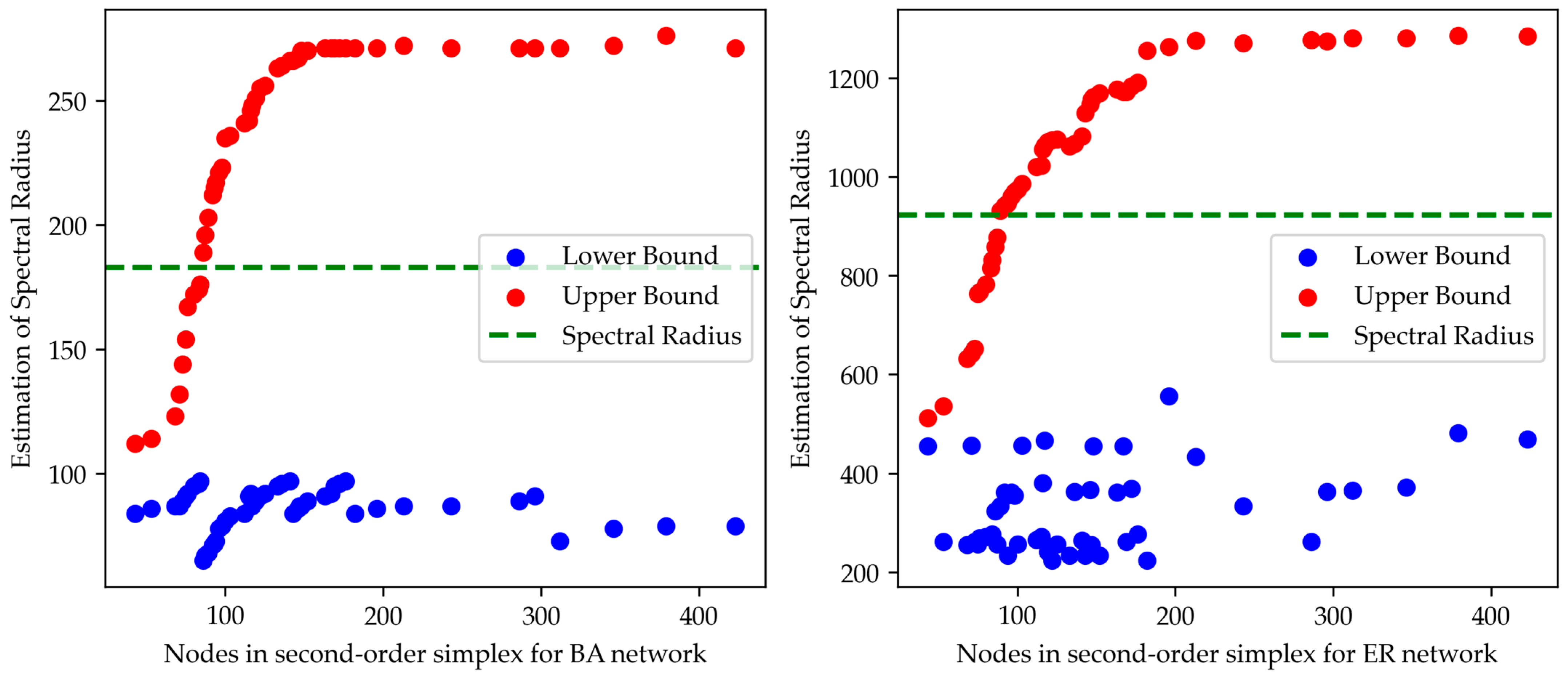 - A method combining graph transformation and random walks is proposed to estimate the bounds of the greatest eigenvalues of the second-order combinatorial Laplacian matrix in big networks with higher-order structures. Simulation investigation on real and synthetic networks confirms the algorithm’s efficacy.