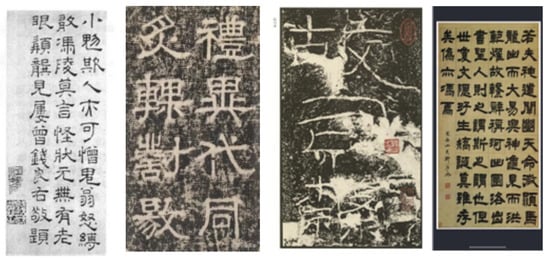 - Xu, P.; Zheng, X.; Chang, X.; Miao, Q.; Tang, Z.; Chen, X.; Fang, D. Artistic information extraction from Chinese calligraphy works via shear-guided filter. J. Vis. Commun. Image Represent. 2016, 40, 791–807. [Google Scholar] [CrossRef]