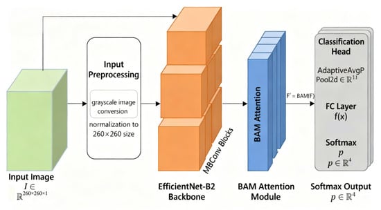 The EfficientNet model incorporating the attention mechanism adopts EfficientNet-B2 as its backbone and embeds the BAM to form a pipeline of “input preprocessing-backbone feature extraction-attention enhancement-classification output” (see Figure 3).