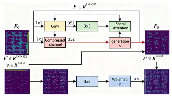 The feature map is convoluted by 1 × 1 to obtain , Spatial attention maps are generated with 3 × 3 convolutions. The spatial attention map is multiplied with to obtain the spatially weighted feature map = ⊙s (see Figure 5).