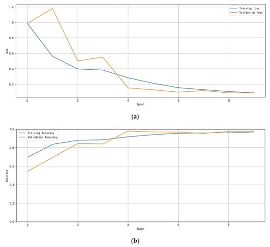 As shown in Figure 7b, during the initial training phase (Epoch 0–15), the training accuracy rises rapidly. In this period, the model quickly captures the discriminative features of the training data, resulting in a marked enhancement in its classification capability.