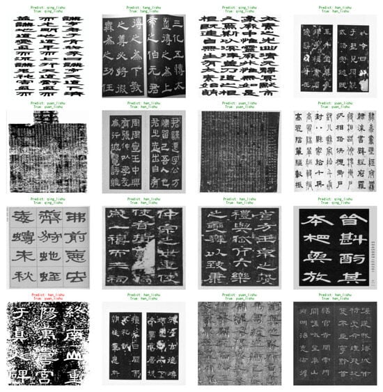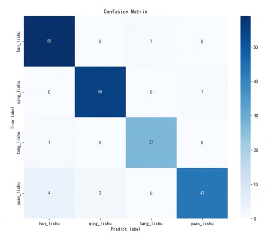 This section presents the classification results for calligraphy samples (specifically Lishu) from four dynasties: Han, Tang, Yuan, and Qing. As shown in Figure 10, the model demonstrates outstanding classification performance for samples from these four dynasties and is capable of accurately identifying unseen samples from the test set.